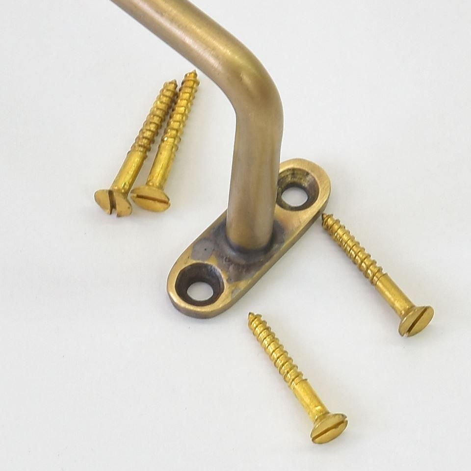 インド製のタオルハンガー。真鍮のマイナスビス4本付き。真鍮製は経年変化に富み、ビンテージの風合いを楽しみたい人におすすめです。真鍮は空気中の成分や皮脂と反応して変色してきます。五円玉の感じです。経年変色は真鍮の魅力ではありますが、ピカピカを好まれる場合は、使用後に柔らかい布で汗や汚れを拭き取ってから保管してください。くすみが気になる場合は、重曹で磨くと綺麗になります。