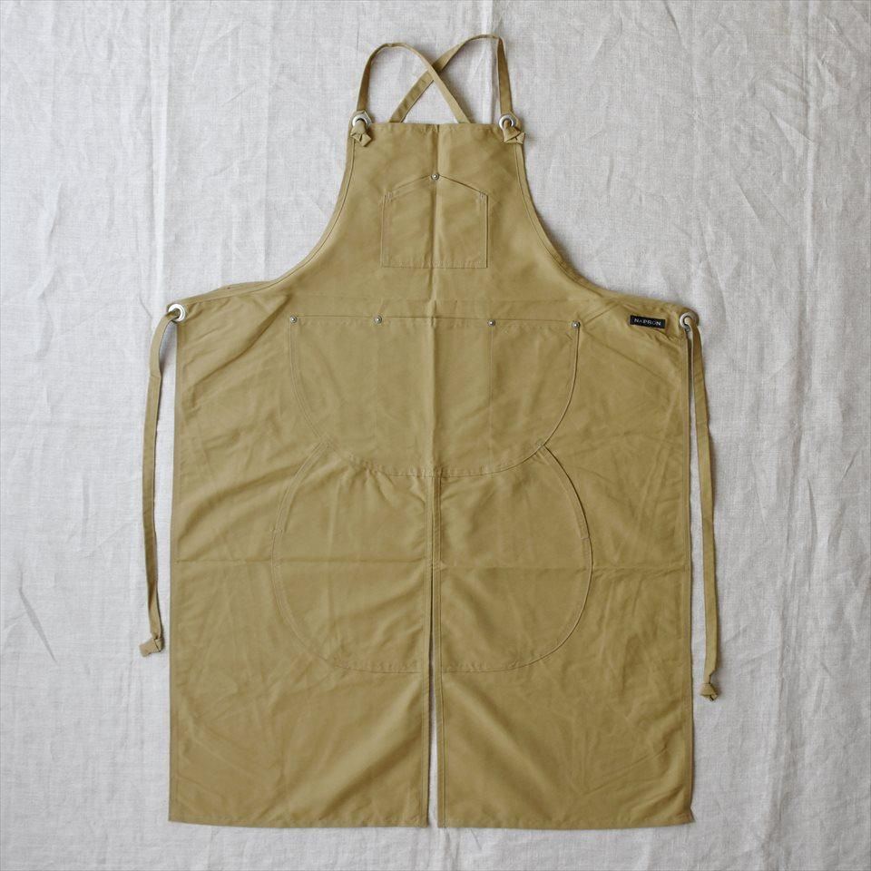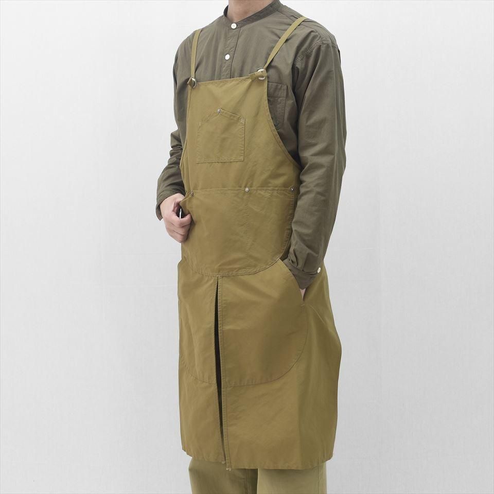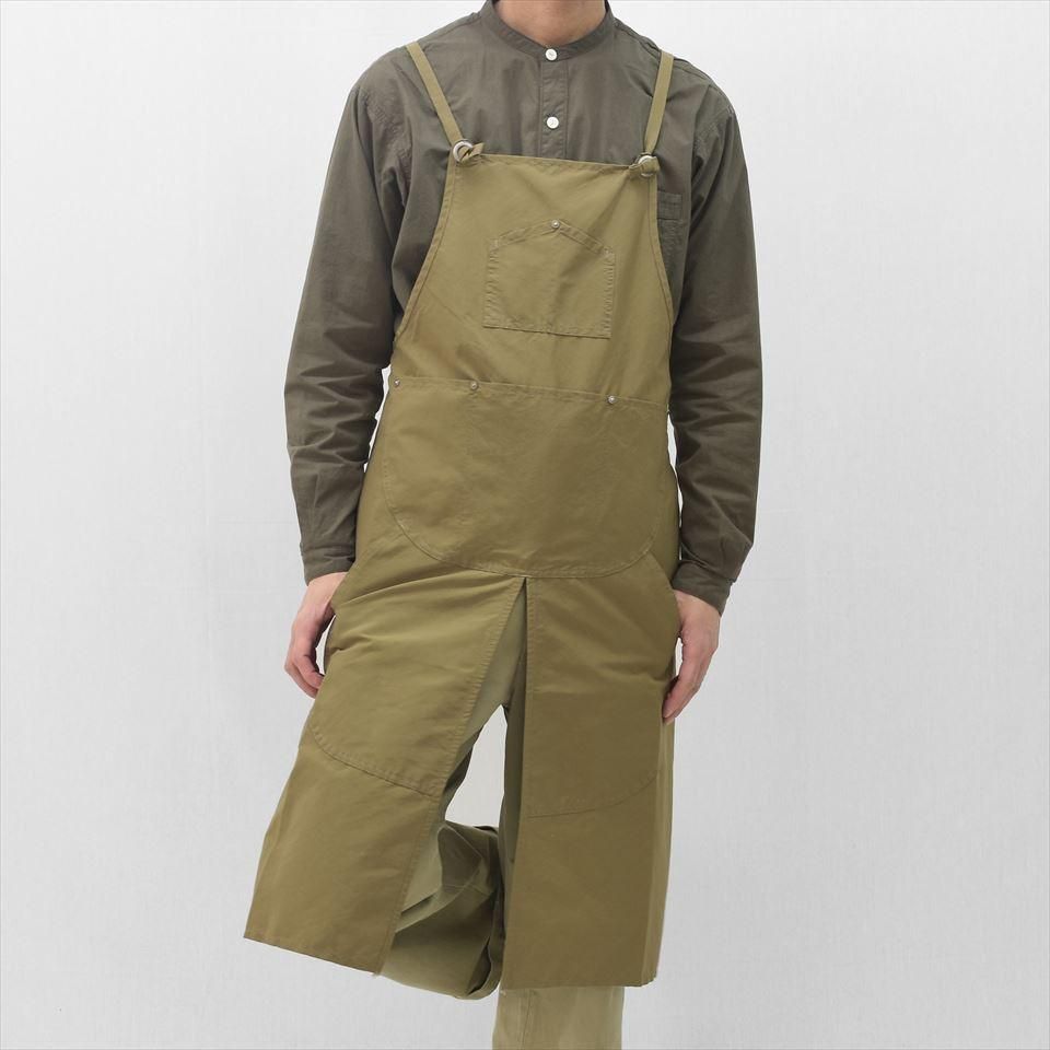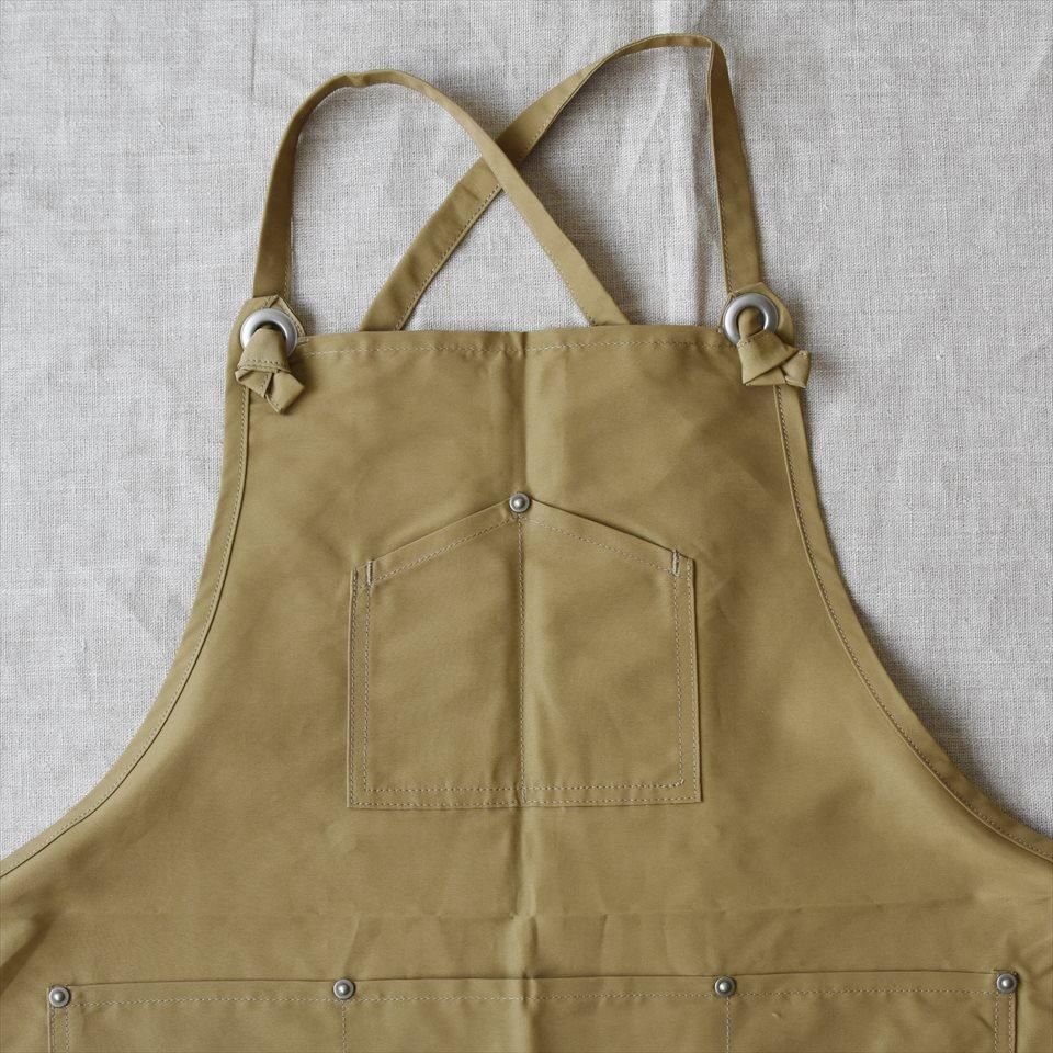 USビンテージエプロンからデザインを引用した一着。胸元や腹部、膝部にある当て布にまでもポケットが付いた機能的なエプロンです。膝のポケットにはタオルなどを入れると膝当てにもなります。後ろはクロスタイプに着ることができる調整紐が付いているので首への負担も少なく、股割れスリット入りなので、足さばきがとても良いのが特徴のエプロンです。