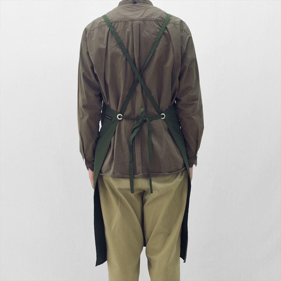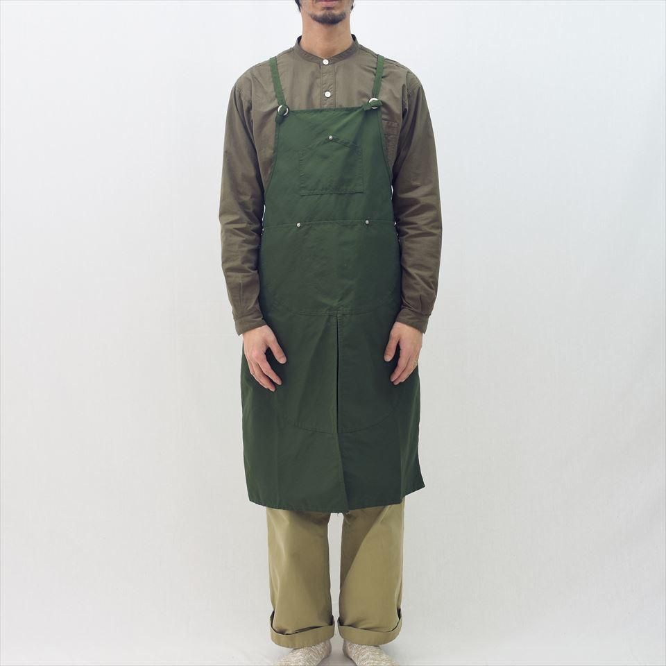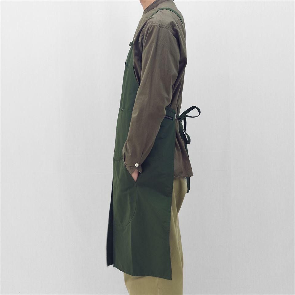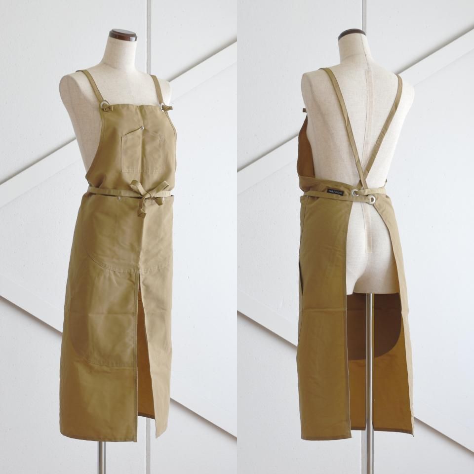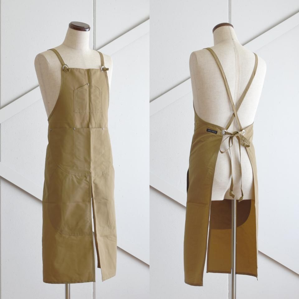 USビンテージエプロンからデザインを引用した一着。胸元や腹部、膝部にある当て布にまでもポケットが付いた機能的なエプロンです。膝のポケットにはタオルなどを入れると膝当てにもなります。後ろはクロスタイプに着ることができる調整紐が付いているので首への負担も少なく、股割れスリット入りなので、足さばきがとても良いのが特徴のエプロンです。