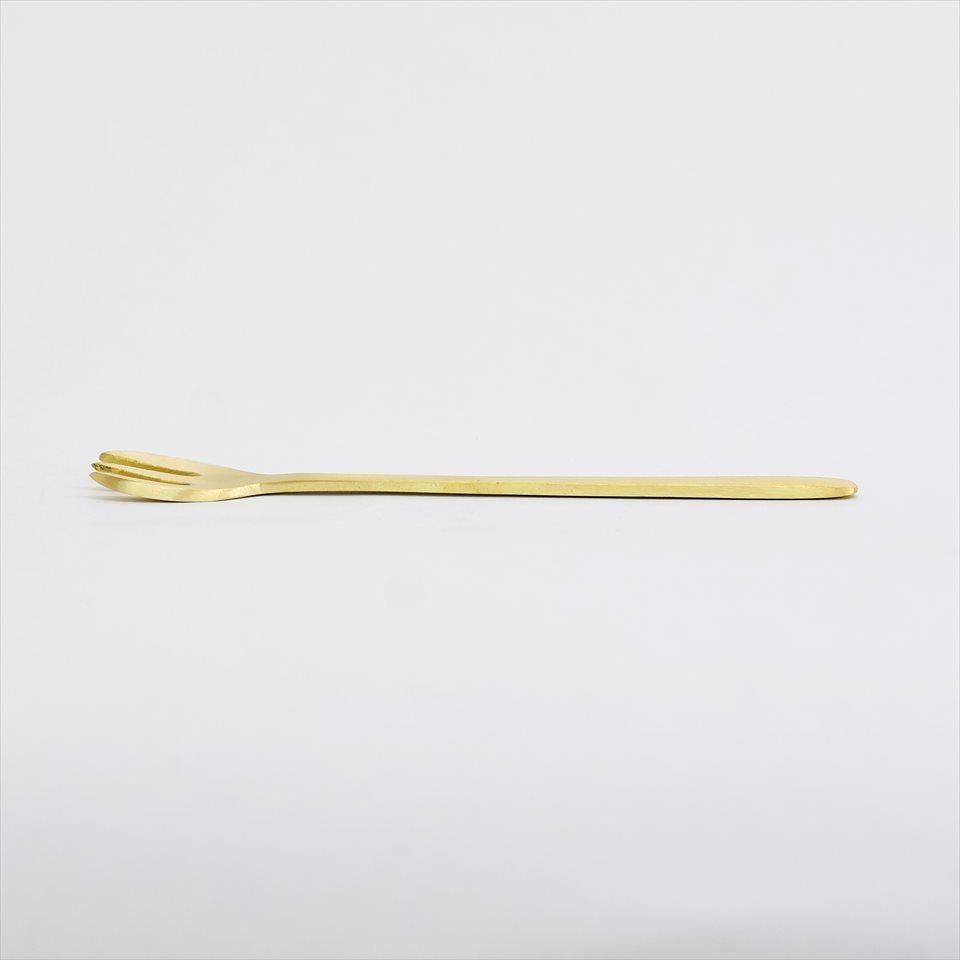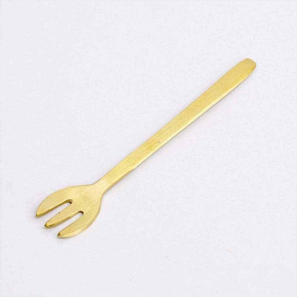インド製のデザートフォーク。真鍮に磨きをかけた、マットな質感に仕上げ。。コンパクトなサイズ感とペタンコのシェイプが かわいらしいデザインです。スルスルとした気持ちの良い舌ざわりで、カットした果物やケーキを食べるのにぴったり。おそろいのスプーンも別売りでご用意しています。