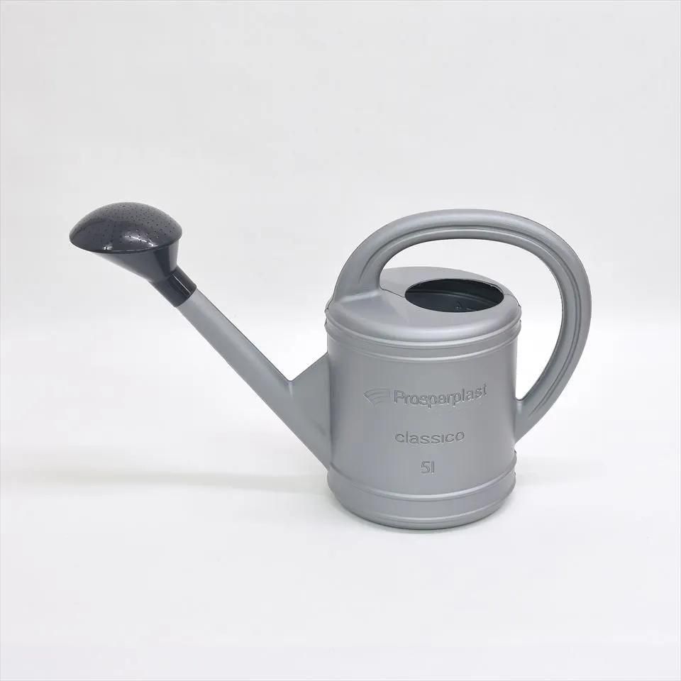 HDPE(高密度ポリエチレン)製のジョーロ。容量5リットルはお庭のガーデニングやベランダの鉢植えにちょうど良いサイズ。シャワーヘッド(黒い部分)は取り外して水差しとして使用可能す。年配の方や非力な方でも使いやすい軽量プラスチックで、強く押すとやや凹む硬さです。