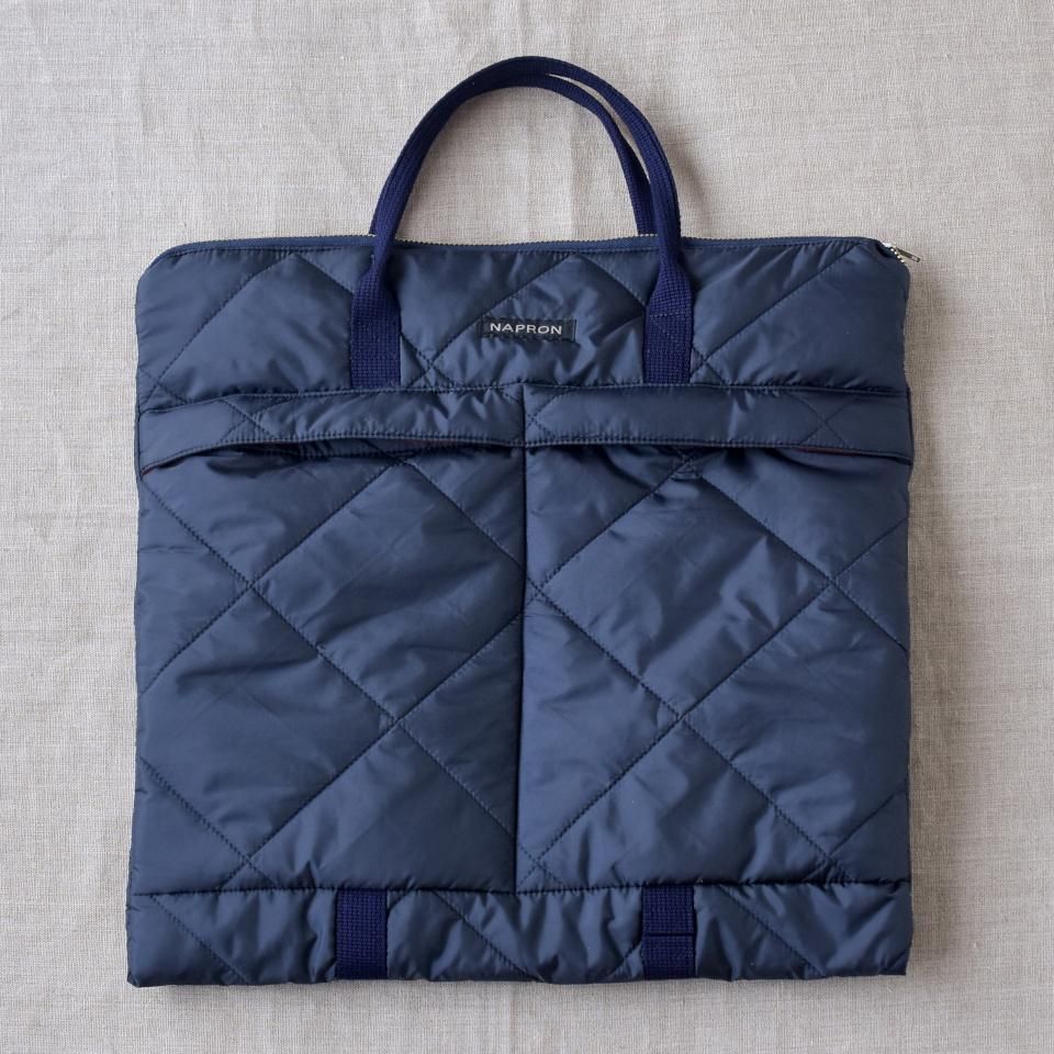 ヘルメットバッグは、1950年ごろに米軍のヘルメットや酸素マスクなどを持ち運ぶために作られたヘルメットバッグを、NAPRONオリジナルキルトでアレンジし仕立てたバッグ。中綿でバッグの中身が守られるため、ノートPC用バッグとしてもお使いいただけます。