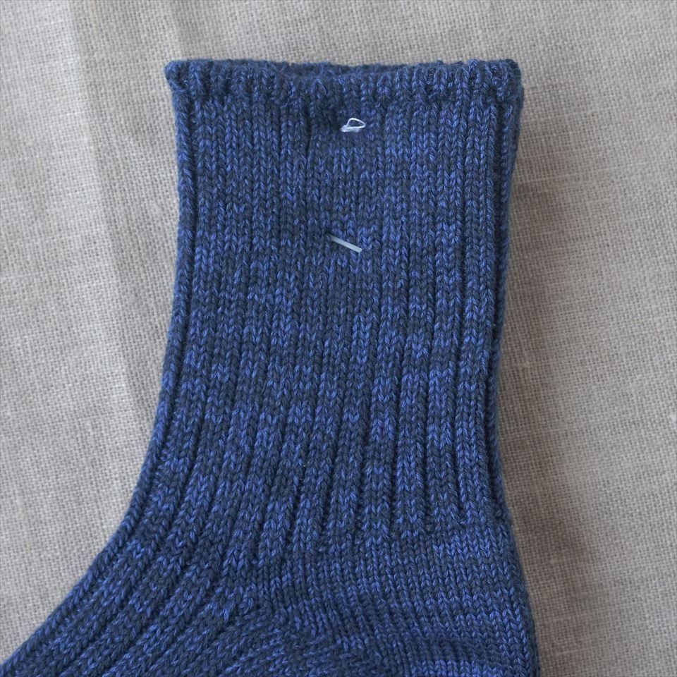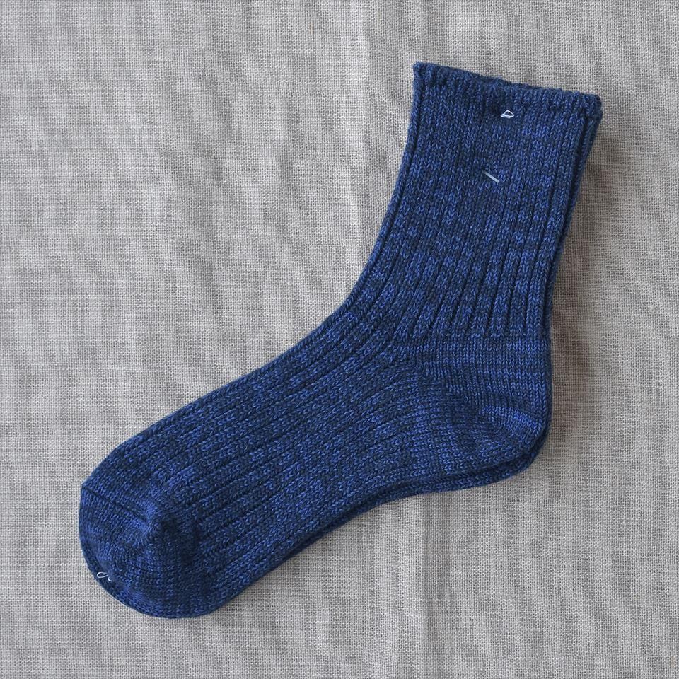 コットン/ヘンプ/アクリルの混合の太めの糸で編み込まれたリブソックス。丈夫で蒸れにくく、締めつけすぎずズレにくいので長時間履いていても疲れにくい靴下。ネップ(糸のかたまり)がなく綺麗めの印象のシンプルな靴下なので、どんな靴にも合わせやすいです。長く履いても穴が開きにくい耐久性があり、アウトドアや作業用靴下として最適。オールシーズン対応の履き心地も良い靴下です。