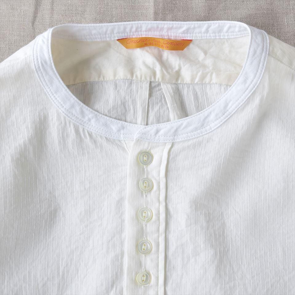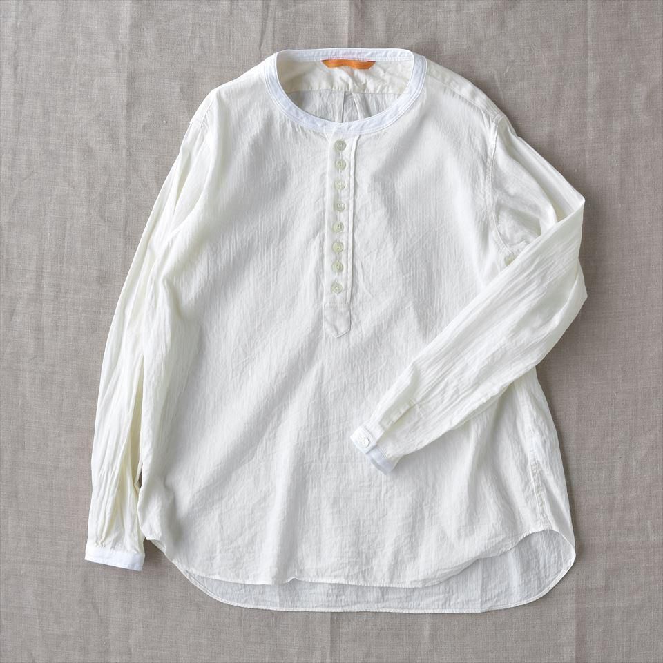 クラシックな雰囲気を漂わせながら、デイリーに取り入れやすい「グランパシャツ」。首元はカットソーのヘンリーネックのようなデザインで、バンドカラーシャツよりもややゆとりがあり、リラックス感のある仕上がりです。深めの被りと詰まったボタンの並びが独特の表情をつくり出し、シンプルながら存在感のある一枚。夏場にも着用できる薄手のドビーストライプ。繊細なテクスチャーは、ドレスシャツのような上品さ。男女問わずしっくりと馴染むデザイン。カジュアルにもきれいめにも幅広くスタイリングが楽しめます。