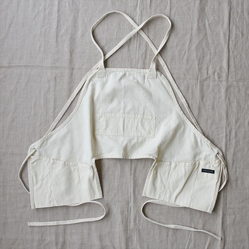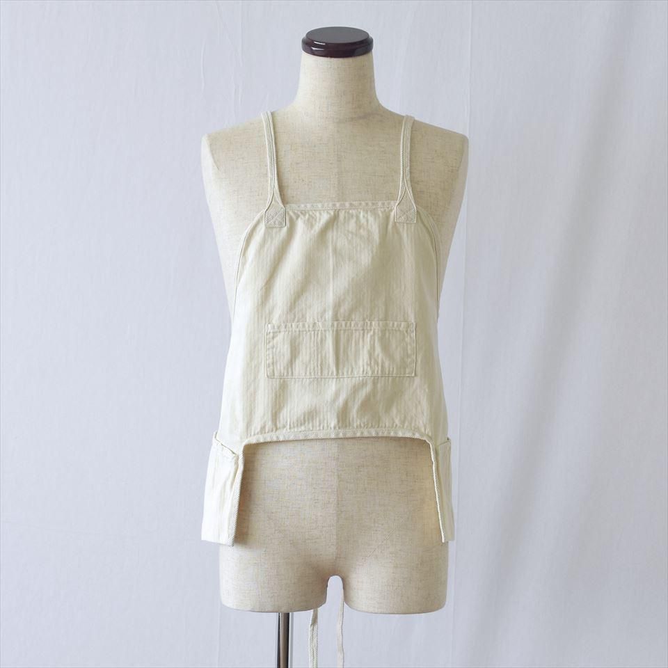 US ARMY 空軍のエプロンをアレンジ。フロントのみ丈が短くなっていて、サイドポケットがフラシになるため、前かがみになってもポケットの中身が落ちにくいショート丈エプロンです。ジャケットやシャツを羽織るとベストのような感覚でお使いいただけます。紐が肩掛けクロス長時間着用しても首や肩など体への負担が少ない仕様。やや薄手でオールシーズン着用できるミニヘリンボーン生地。