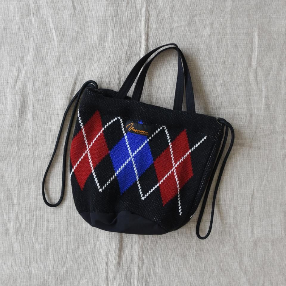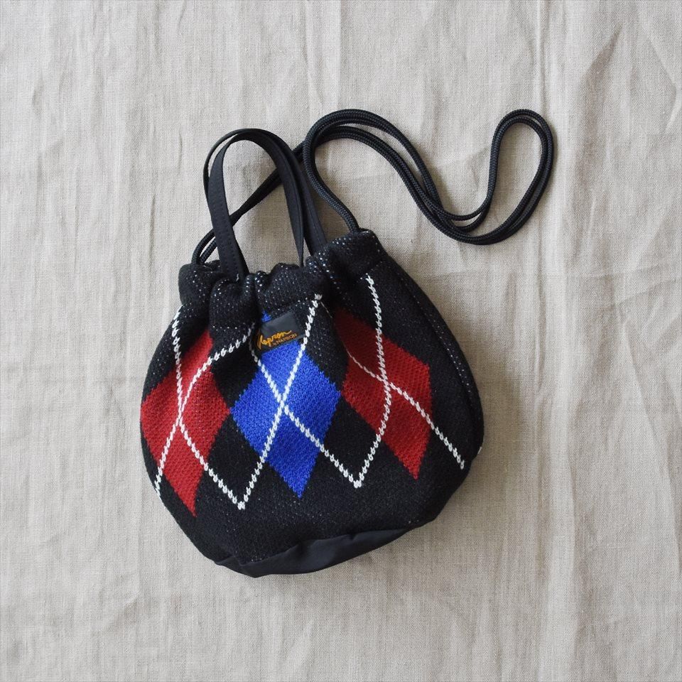 丸っこい形が可愛らしいナプロン人気型で巾着式のバッグのミニサイズ。ポーチとしても使えるサイズ感です。デイリーバッグとしてお使いいただけるほか、旅行時のバッグインバッグとしてなど様々なシーンでお使いいただけます。横編み機で作られたニット素材。スコットランド発祥のダイヤ格子柄の「アーガイル」をボディーに配置しています。洗濯機で弱洗いが可能です。