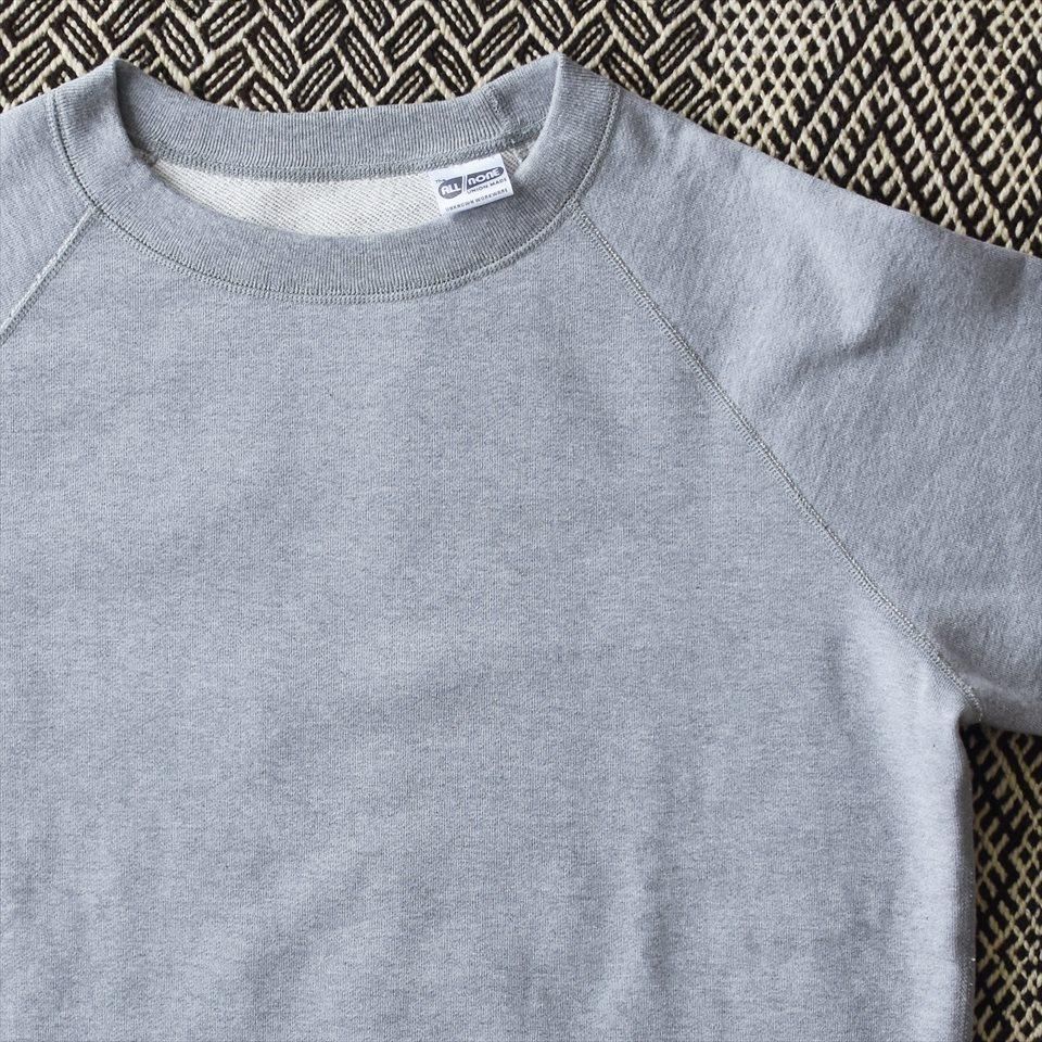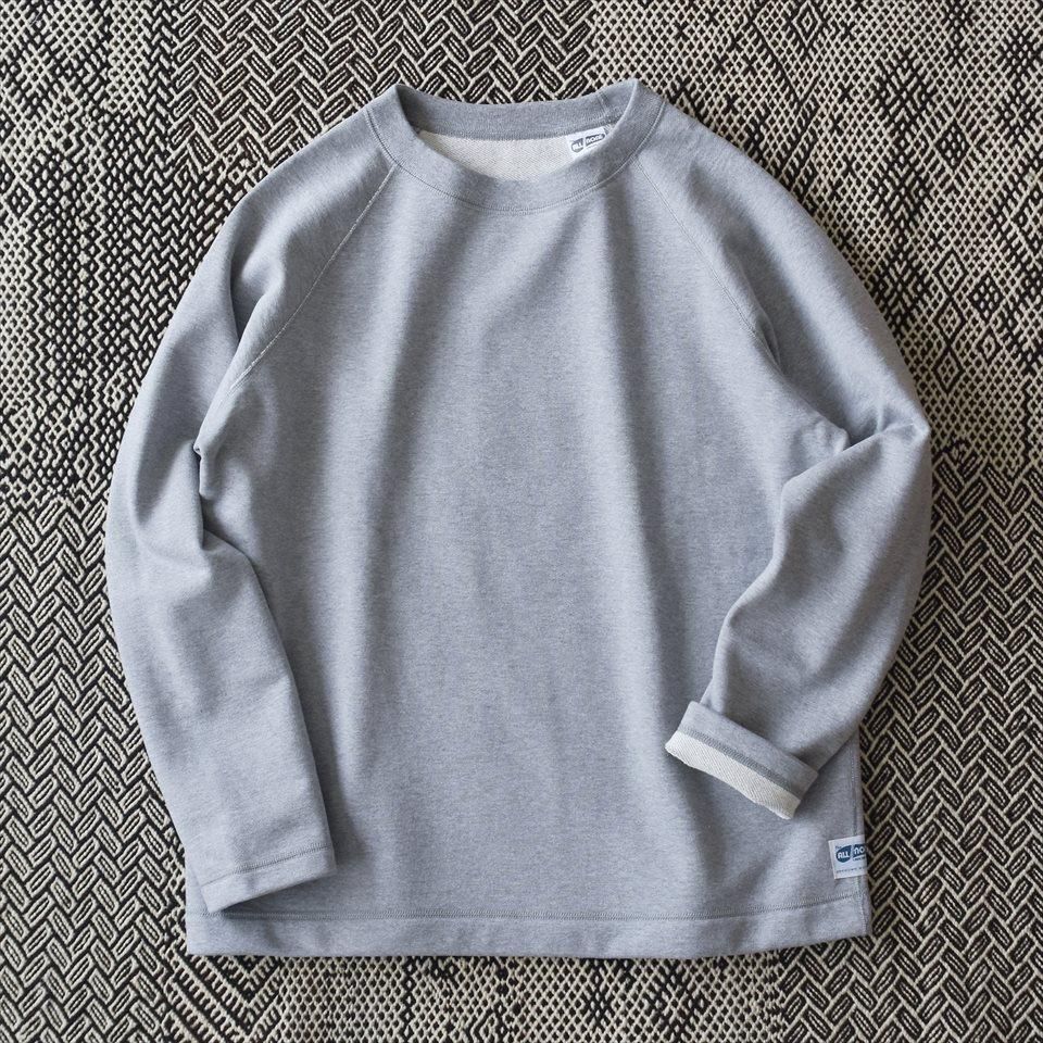 ラグランスリーブのツイストパイル・スウェット。首回りに若干のゆとりを設け、袖口と裾はリブで絞らずにをストレートカットになっています。ロンTやシャツの上に着ても、首回り、裾、袖口のリブや袖がヨレず、また、裏毛は裏起毛に比べてモコモコ感も少なく、重ね着をしてもスッキリと着こなせます。着心地はスウェットですが、着回しはバスクシャツと裏起毛スウェットの中間のような位置付けです。