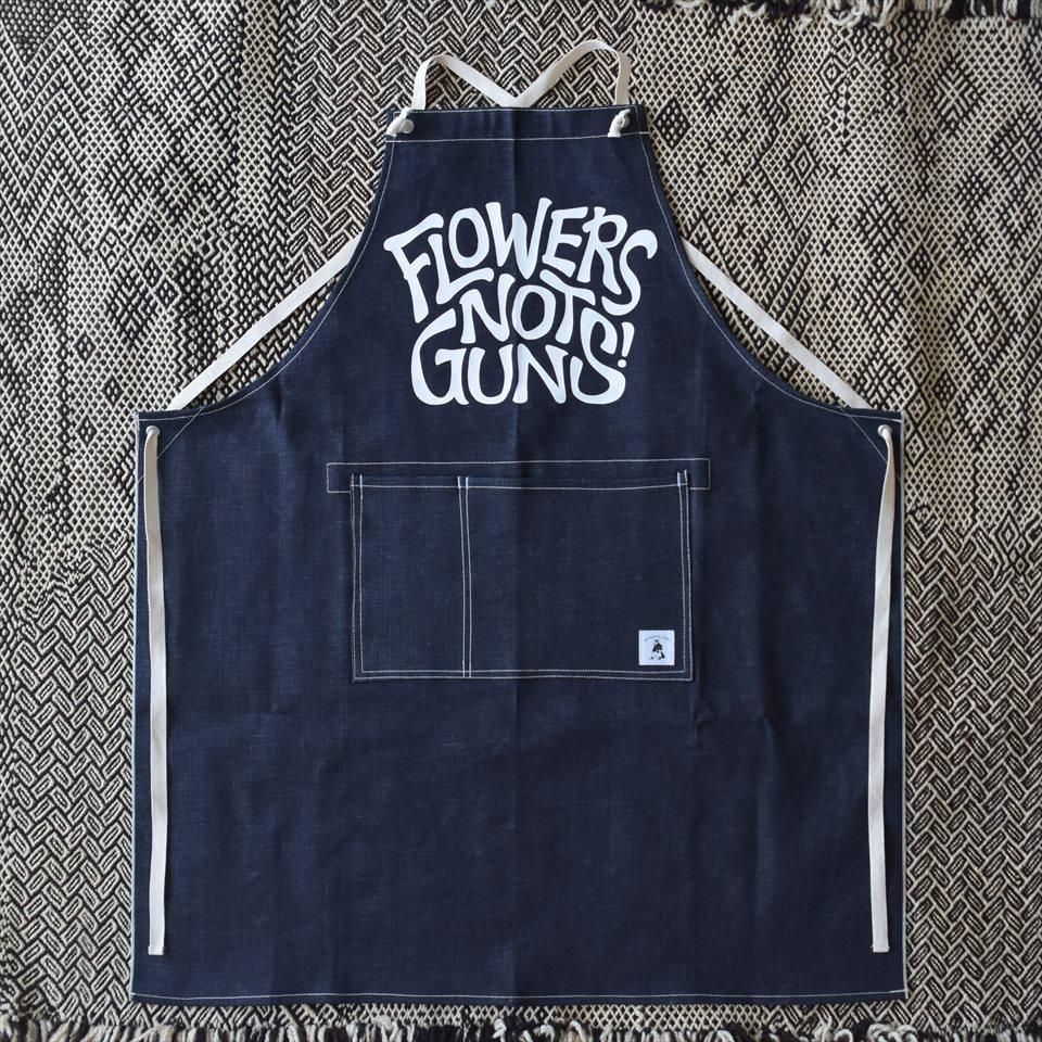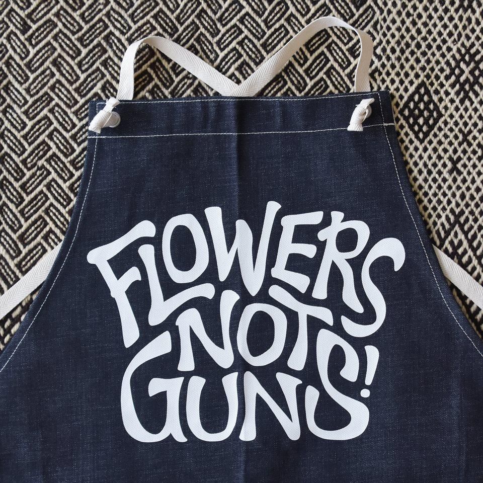「自分で育てるエプロン」にシルクスクリーンでFLOWERS NOT GUNS!をプリントしたエプロン。倉敷産デニム。