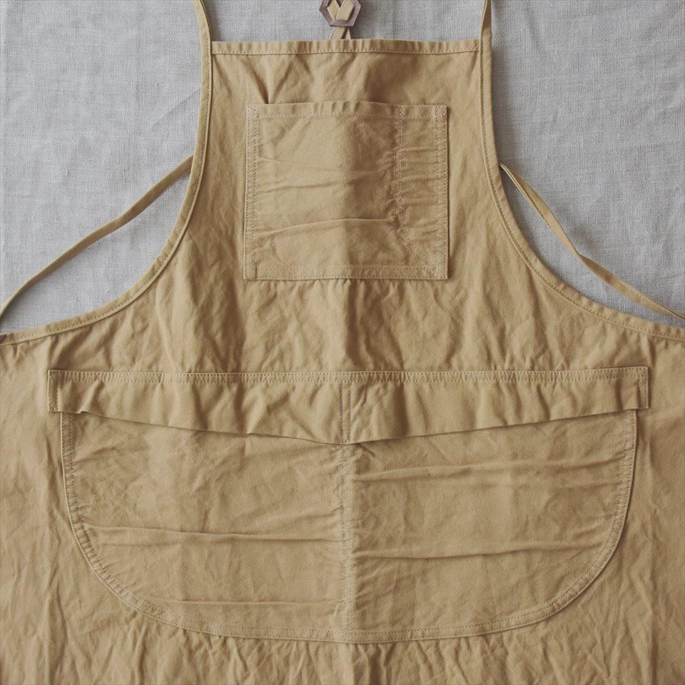 ヴィンテージライクなキャンバス生地や縫製の技術により、ワークウエアの見どころのひとつでもあるパッカリングによって立体が生まれ、これにより着用時の力強い印象になっています。生地の特性を研究し尽くして作られたこのエプロンは、他に類を見ない時の経過を感じさせる仕上がりとなっています。機能的にも抜群の強度を誇る生地・縫製ですので、プロ(道具)仕様です。