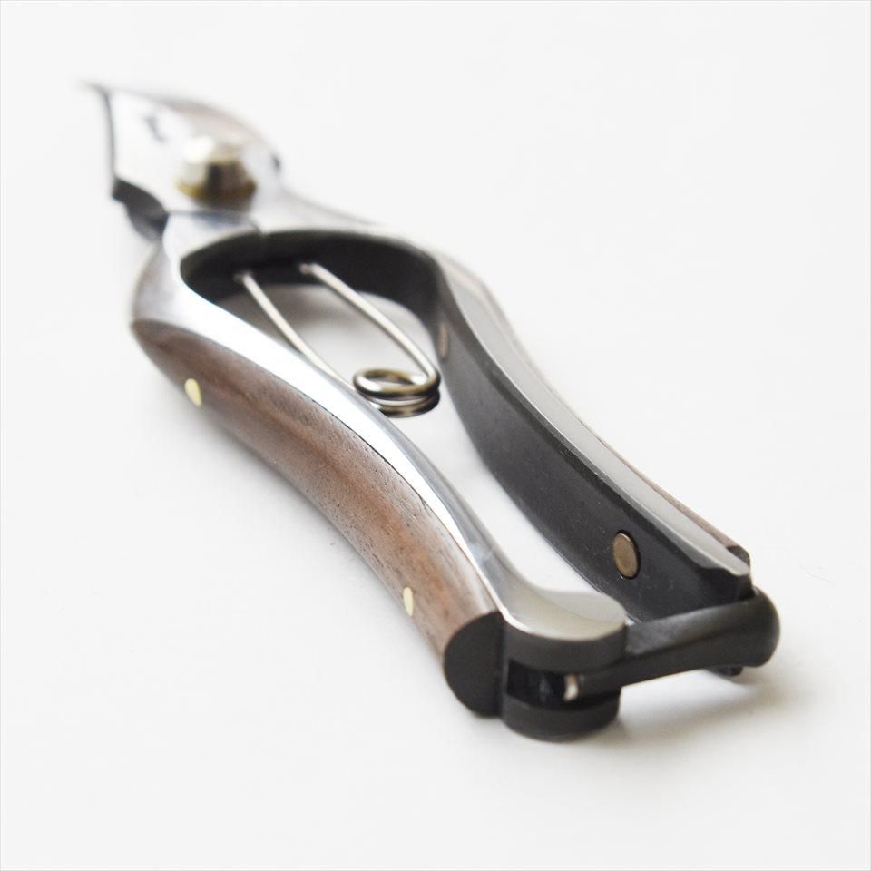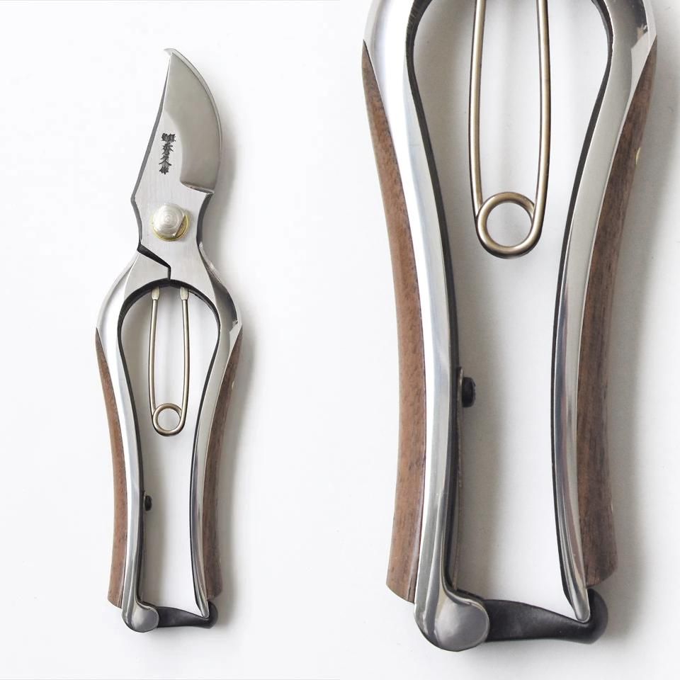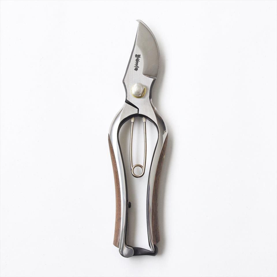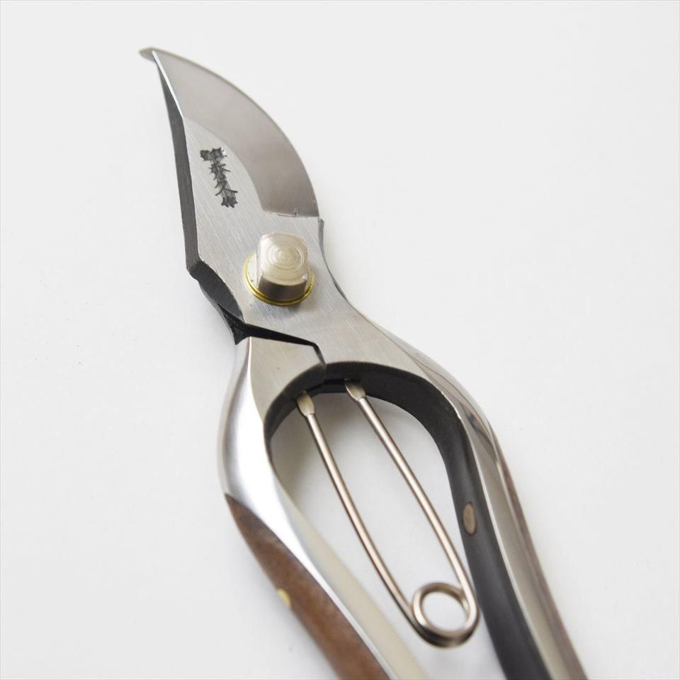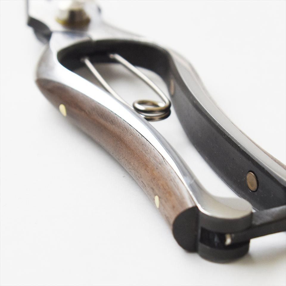 職人による手造りの一品。鉄と木(ウォルナット)を張り合わせたハンドルは手作業で削り出す作り手の技。 軽量で握り心地良く、使い込むほど味わい深さが増してくる外山刃物の特別な鋏(はさみ)です。本製品の最大切断能力は、目安として生木直径12ミリまでです。