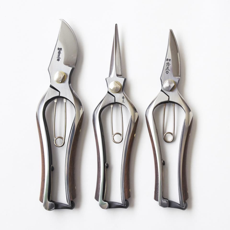 外山刃物の創業は、江戸時代の文久年間にさかのぼり、越後木鋏の宗家として、初代龍松氏(銘:龍松)、二代目富次郎氏(銘:珍龍)、三代目秀吉氏(銘:龍山)、四代目秀久氏(銘:秀久)が、金物の街三条で代々受け継がれてきた植木鋏メーカーです。木鋏の製造は、鍛造、上げ打ち、焼き入れ、焼戻し、表すり、色付け、裏刃と切刃の重研削と仕上げ研磨、組立、調整(合い刃どり)をはじめとして、いくつもの工程を経てなされます。その工程ごとに鋼(ハガネ)を知り尽くした匠の技で作られています。また、新しい技術を取り入れ、現在もっともプロの園芸家に信頼される鋏メーカーの一つとして、「宗家秀久作」の刻印の鋏は愛用されています。