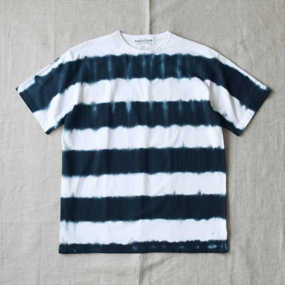 筒状に編み上げたサイドに縫製がない丸胴ボディに、かご染めを施したボーダーTシャツ。