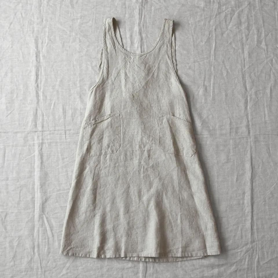 膝丈のジャンパースカートのようなエプロンです。Aラインのシルエットで、部屋着やお買い物の時にも使えるデザインです。胸元がゆったり開いていて、ニットやシャツとのコーディネートも楽しめます。クロスバックは肩や首に負担がかかりにくく、肩こりの方にもおすすめです。リネン素材は丈夫で軽く、水分をサッと吸収してくれるから、とても快適です。しかも洗濯機で洗えるから、いつでも清潔な状態を保てます。身長に関係なくフィットしやすく、贈り物にもぴったり。