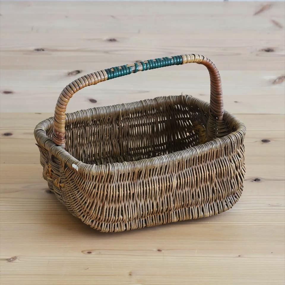 イギリスで使われていたウィローバスケット。皮付きの柳の枝を編み上げたバスケットは、天然木の自然のままの風合いが特長。樹皮の色味や凹凸は素朴かつ無骨の印象で、ヨーロッパで古くから受け継がれている製法で作られています。ところどころ、ラフィア麻と思われる素材で修理が施されており、これにより個性的な逸品となっています。また、歪んだ形も良い味わいです。まだまだ現役で使える状態です。