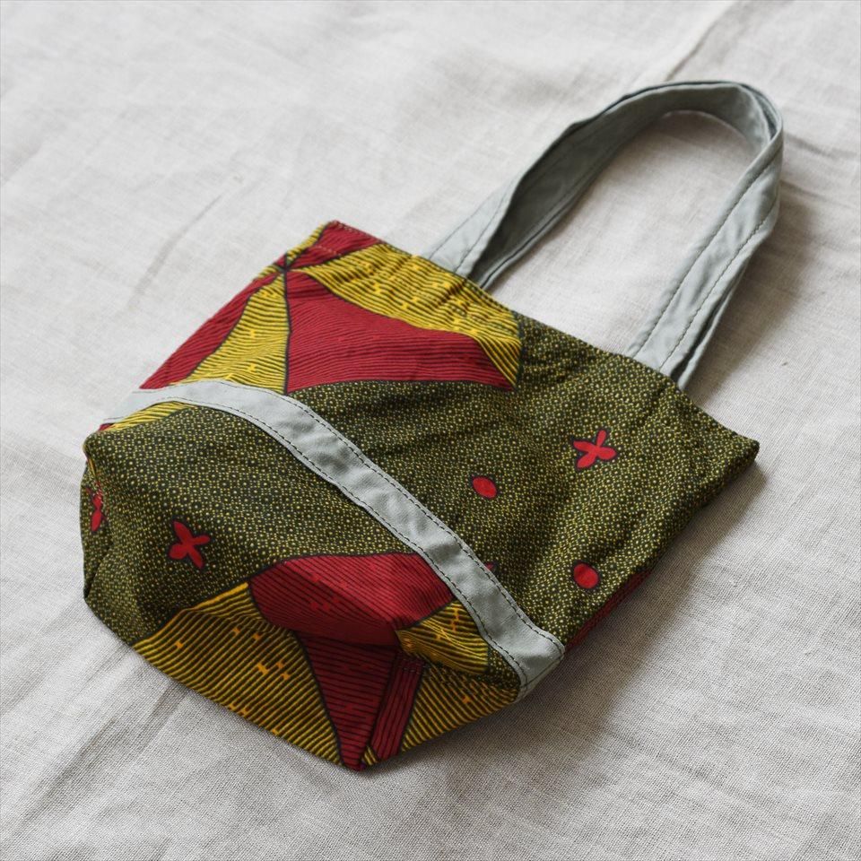 西アフリカの生地を使用したサーフスタイルのバッグ。小ぶりなトートバッグですが、内布付きで、しっかりとした縫製で仕上げられています。多目的に使える小ぶりなミニトートです。