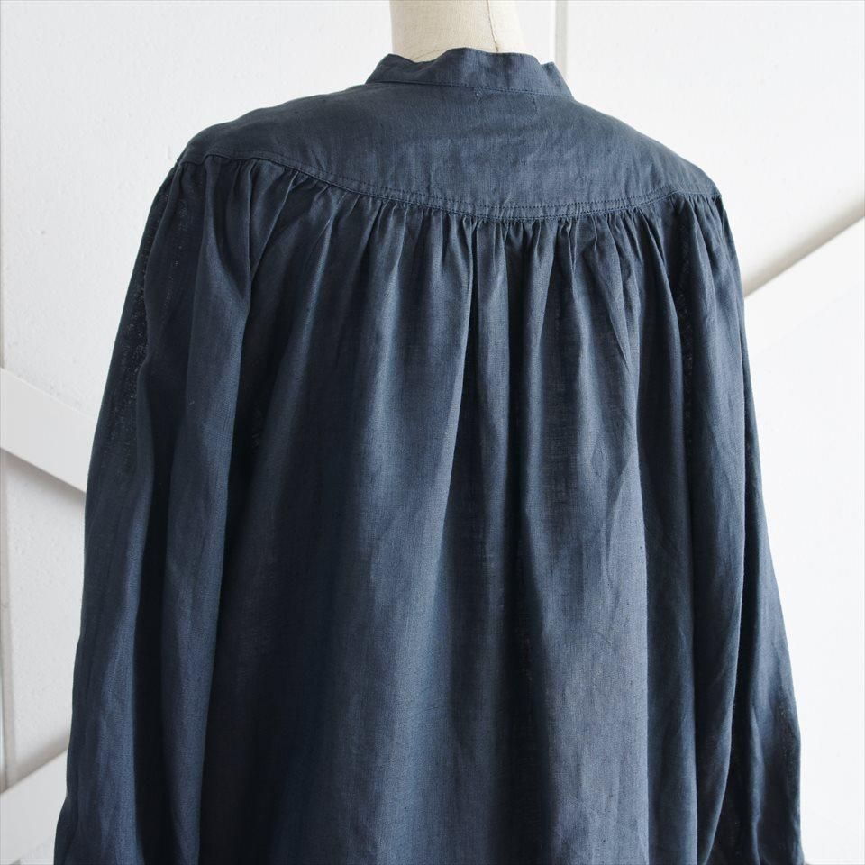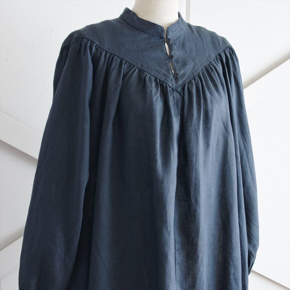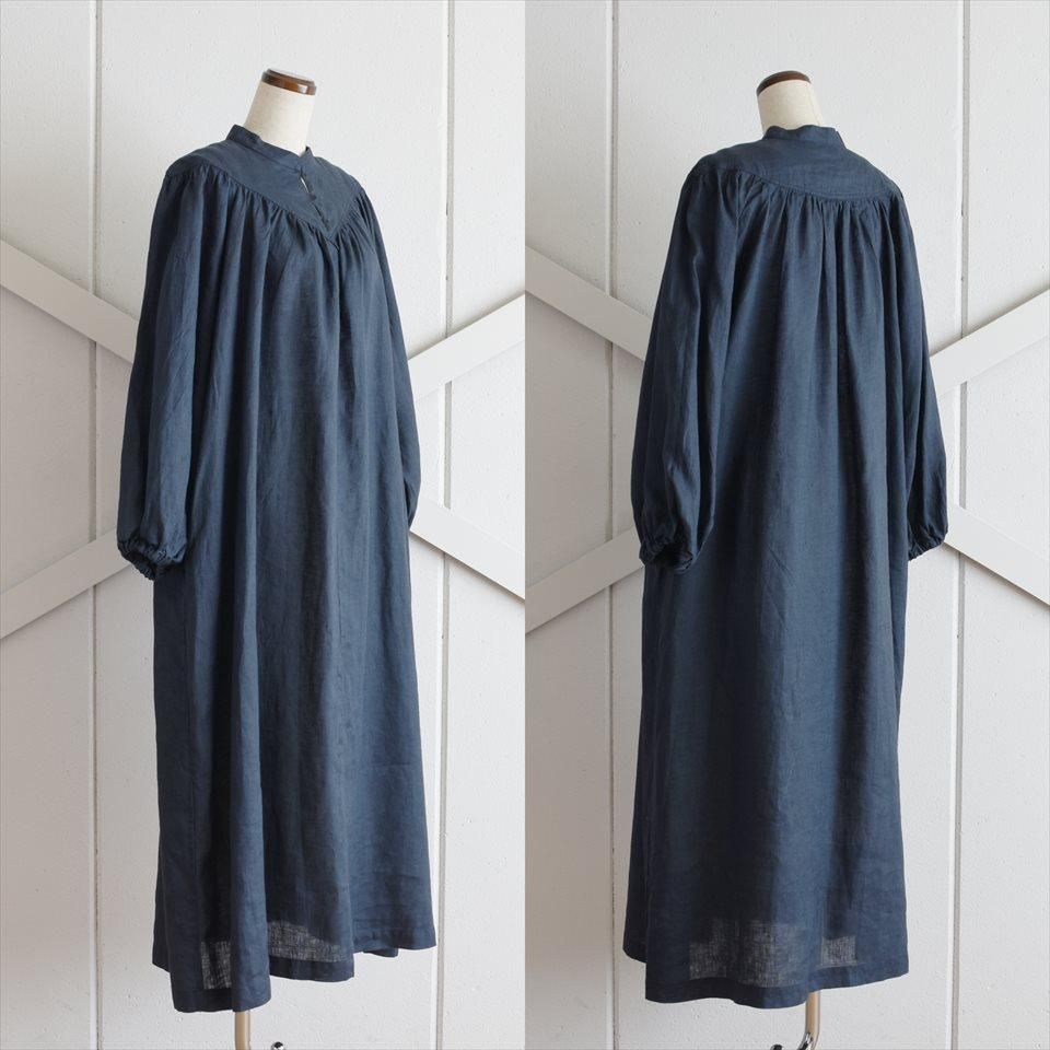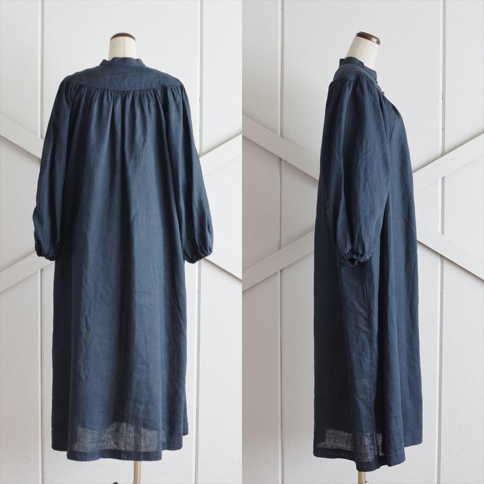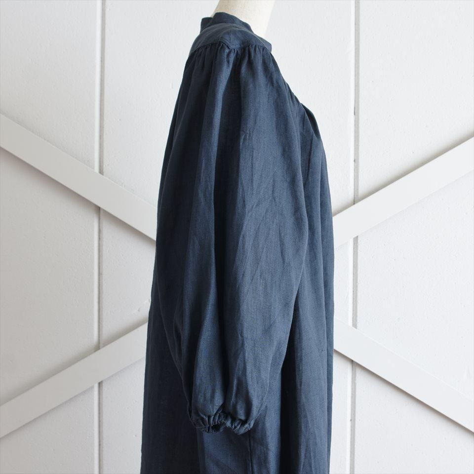 ヴィンテージのドレスの雰囲気をまとった、ふんわりとしたワンピース。首元のV字のカットや豊かなギャザーが寄せられた胸元が魅力的。そして、柔らかなパフスリーブは優雅なボリュームを生み出し、凛とした品のある印象となります。軽やかなリネン素材が使用されているため、着心地も快適そのもの。袖丈はわずかに短めに設定され、さりげない抜け感を演出しています。日常使いはもちろん、特別な場面でも品格を際立たせます。小物の使い方で様々なシーンで着ていただけます。両サイドには便利なポケットも付いています。