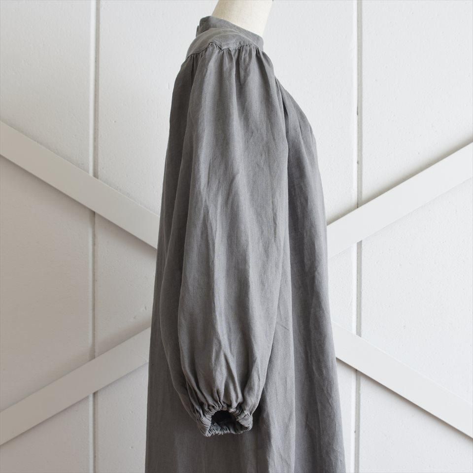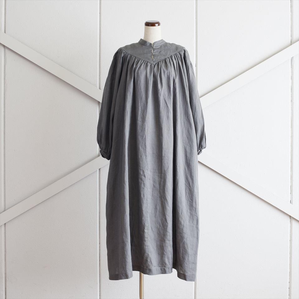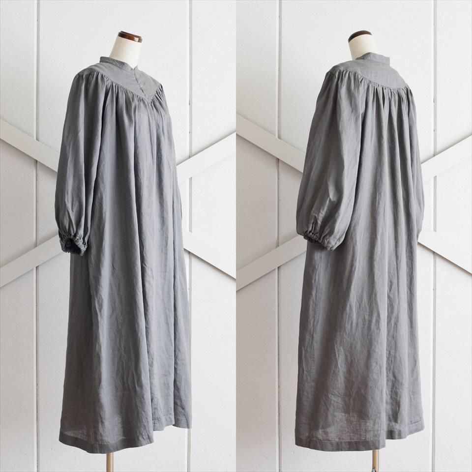 ヴィンテージのドレスの雰囲気をまとった、ふんわりとしたワンピース。首元のV字のカットや豊かなギャザーが寄せられた胸元が魅力的。そして、柔らかなパフスリーブは優雅なボリュームを生み出し、凛とした品のある印象となります。軽やかなリネン素材が使用されているため、着心地も快適そのもの。袖丈はわずかに短めに設定され、さりげない抜け感を演出しています。日常使いはもちろん、特別な場面でも品格を際立たせます。小物の使い方で様々なシーンで着ていただけます。両サイドには便利なポケットも付いています。
