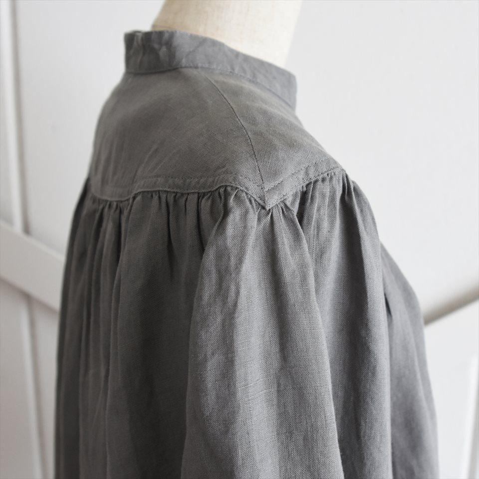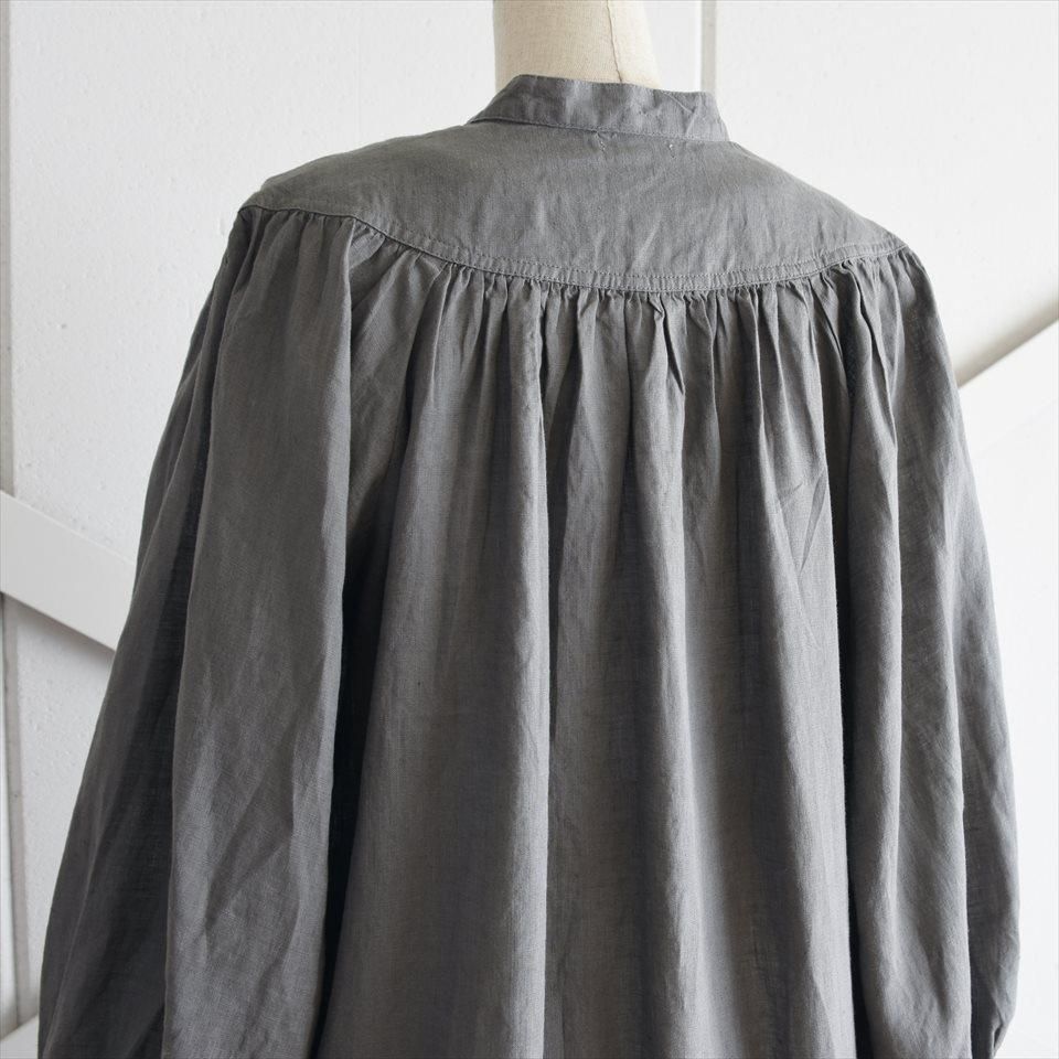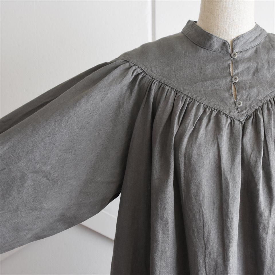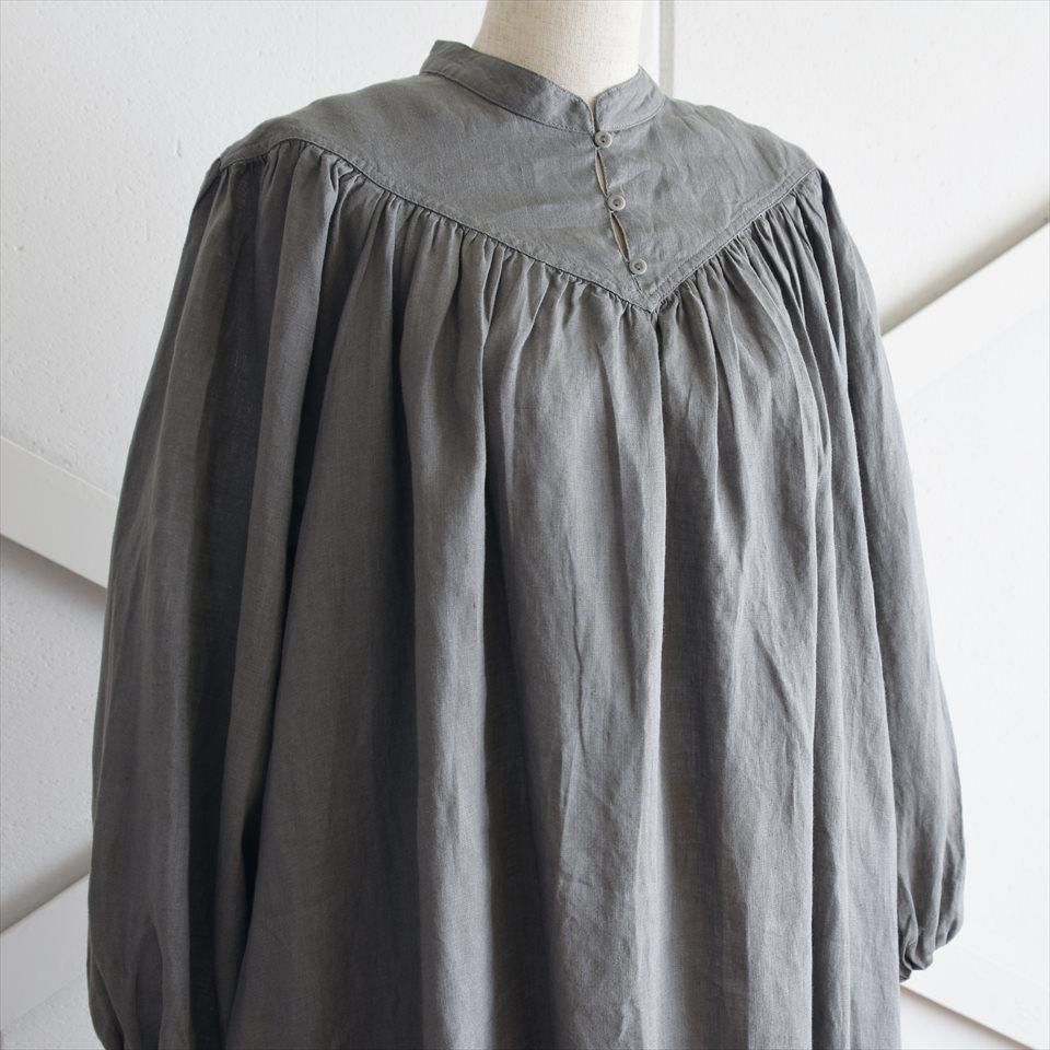 ヴィンテージのドレスの雰囲気をまとった、ふんわりとしたワンピース。首元のV字のカットや豊かなギャザーが寄せられた胸元が魅力的。そして、柔らかなパフスリーブは優雅なボリュームを生み出し、凛とした品のある印象となります。軽やかなリネン素材が使用されているため、着心地も快適そのもの。袖丈はわずかに短めに設定され、さりげない抜け感を演出しています。日常使いはもちろん、特別な場面でも品格を際立たせます。小物の使い方で様々なシーンで着ていただけます。両サイドには便利なポケットも付いています。