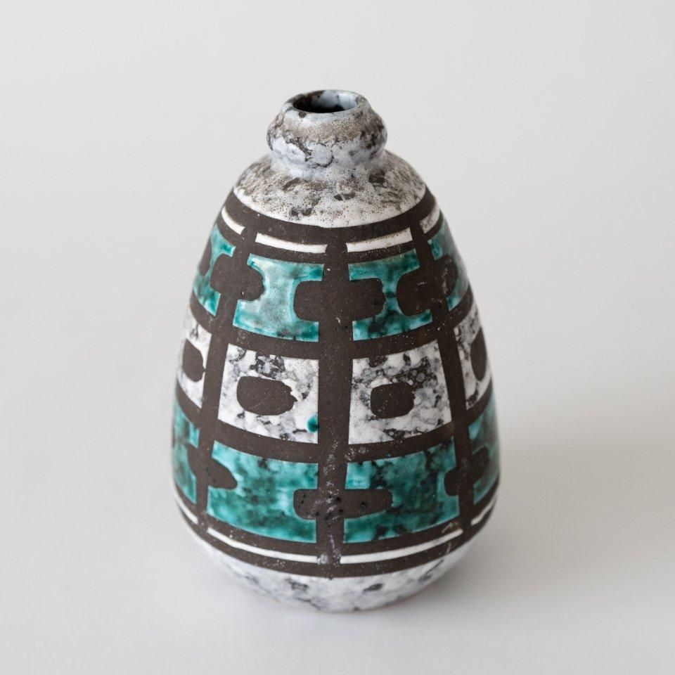 旧東ドイツ時代の1960〜70年代に制作された、VEB Strehla(シュトレーラ)製のFat Lava(ファットラヴァ)フラワーベース。モダンアートのような手描きのタッチが特徴的な花器は、その緑がかったブルーの発色や、ぽてっとした丸みのあるフォルムによって、優しく可愛らしい印象です。一際目を引く存在感を持っていて、花を生けることで、その美しさが一層際立ち、空間に温かな活気が生まれそうな一品です。