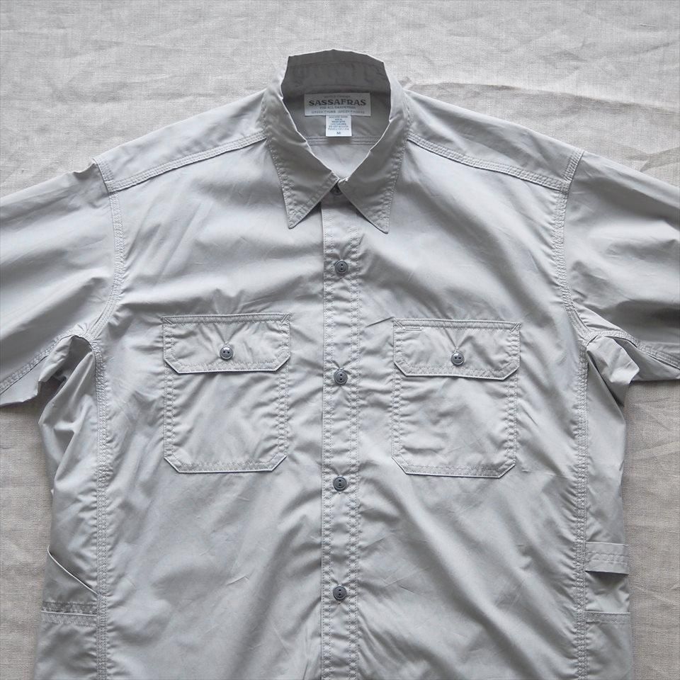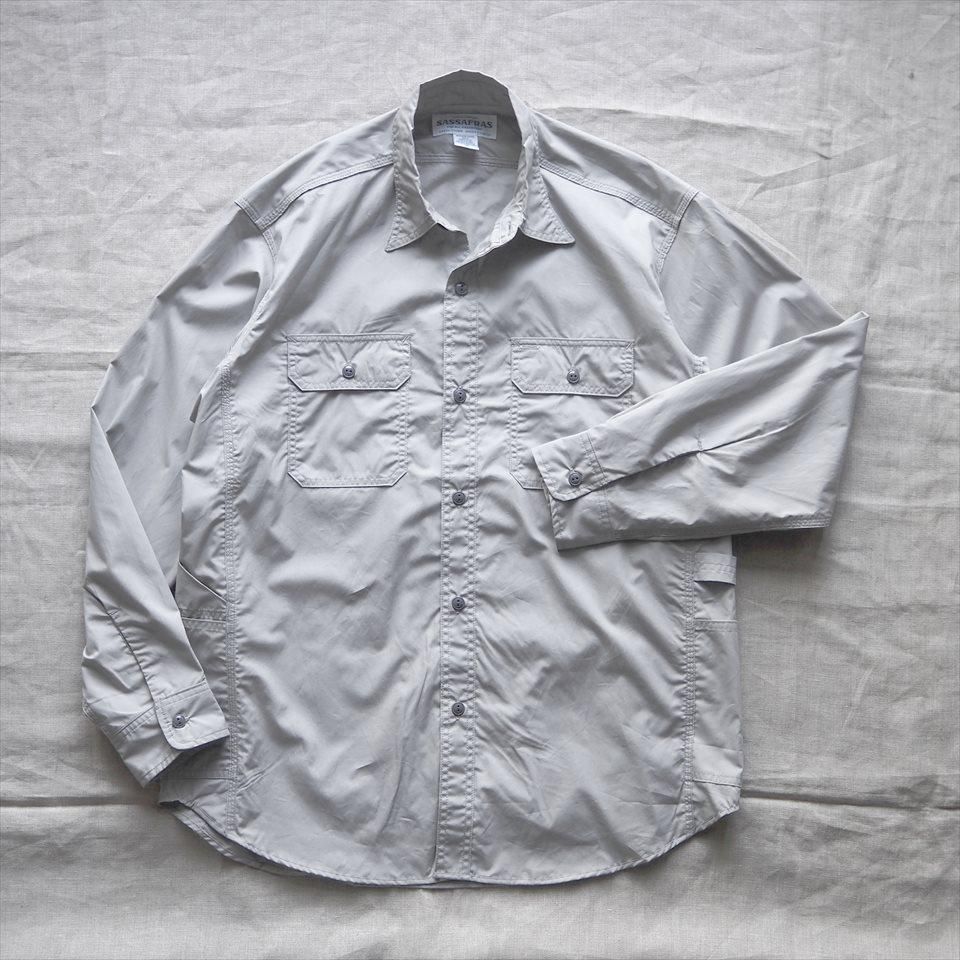ササフラスの代表的なデザインの一つ、ガーデナーシャツ。ペインターパンツのディテールを取り入れたハンドツールが入るサイズのサイドポケットが特長的。身巾や袖口が広めのデザインなので、ジャケット感覚で羽織れる一着です。腕まくりをしてTシャツに羽織る真夏の長袖シャツとして着ても格好良いですね。