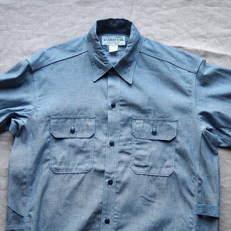 ササフラスの代表的なデザインの一つ、ガーデナーシャツ。ペインターパンツのディテールを取り入れたハンドツールが入るサイズのサイドポケットが特長的。身巾や袖口が広めのデザインなので、ジャケット感覚で羽織れる一着です。腕まくりをしてTシャツに羽織る真夏の長袖シャツとして着ても格好良いですね。生地は定番シャツとしてワードローブに一着は欲しいシャンブレー。ホワイトステッチ、ネイビーボタン。
