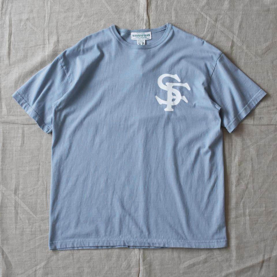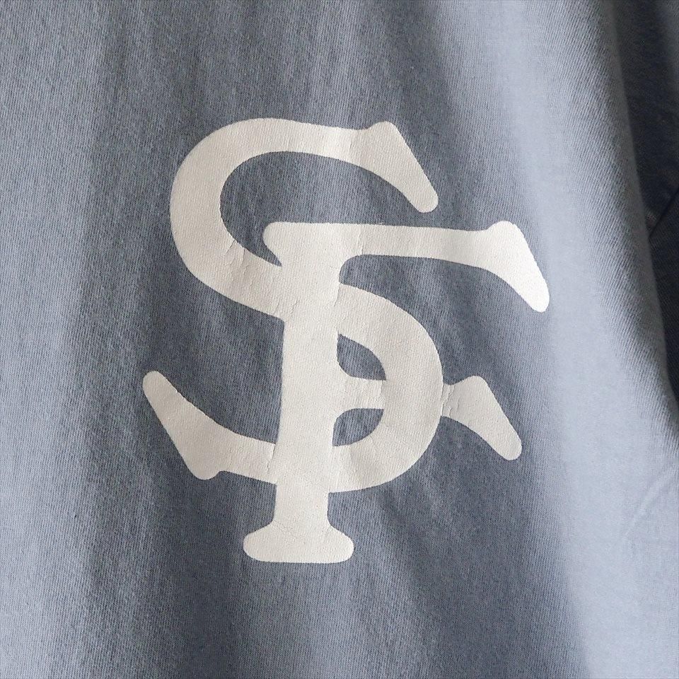 筒状に編み上げたサイドに縫製がない丸胴ボディに、ヴィンテージのようなクラック(ひび割れ)が出やすい厚めにプリントされたロゴTシャツ。グレー表記ですが、色味はややトーンダウンしたサックス(水色)のような色味です。(※ロゴTシャツですが、毎年制作されるものではありませんので、お買い逃がしのないようご注意ください。完売後の再入荷も、現時点では予定はございません。)