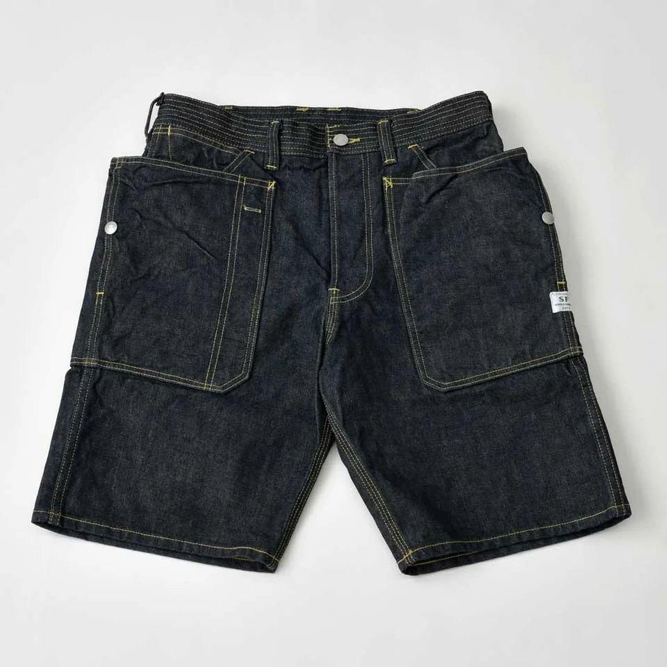 ササフラスの代表作の一つフォールリーフ・パンツのショート丈。左綾デニムのイエローステッチで肉厚の13.5オンスは履き込むと味わいのある経年変化を楽しめます。最大の特徴はなんといっても大きめのツールポケット。ガーデニングはもちろん、あらゆるハードワーカーにオススメです。