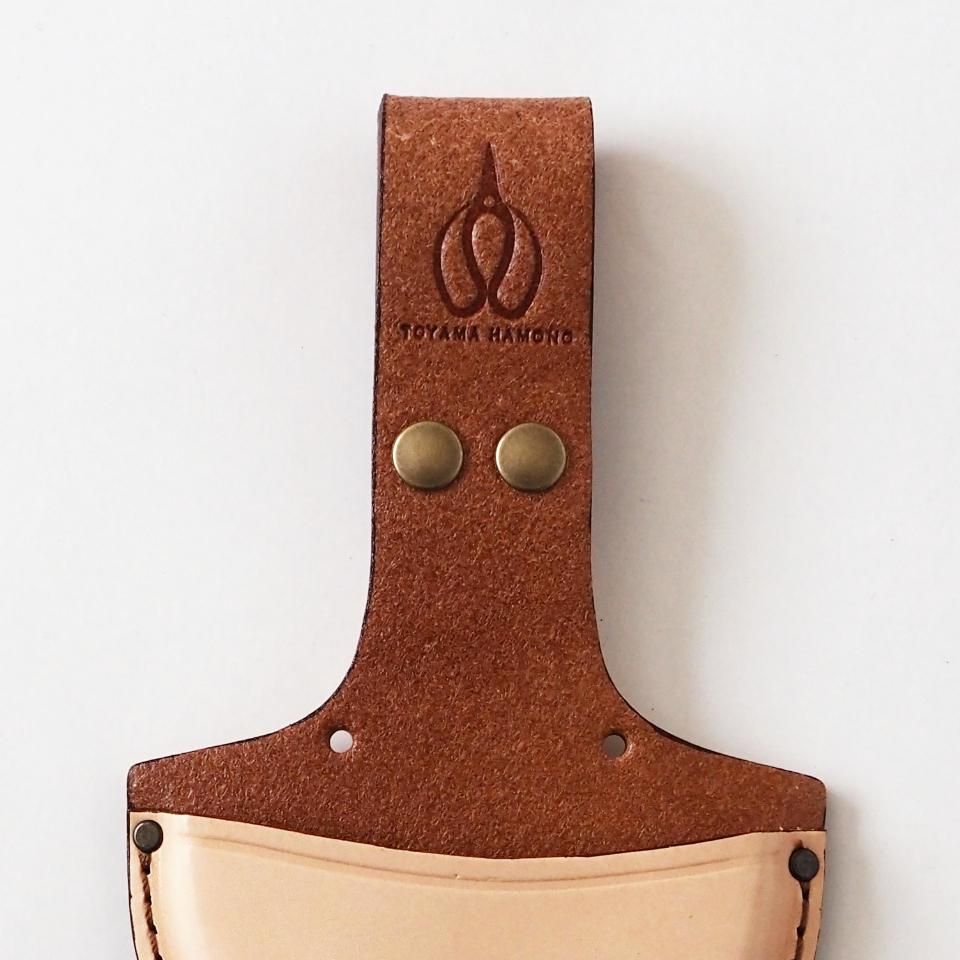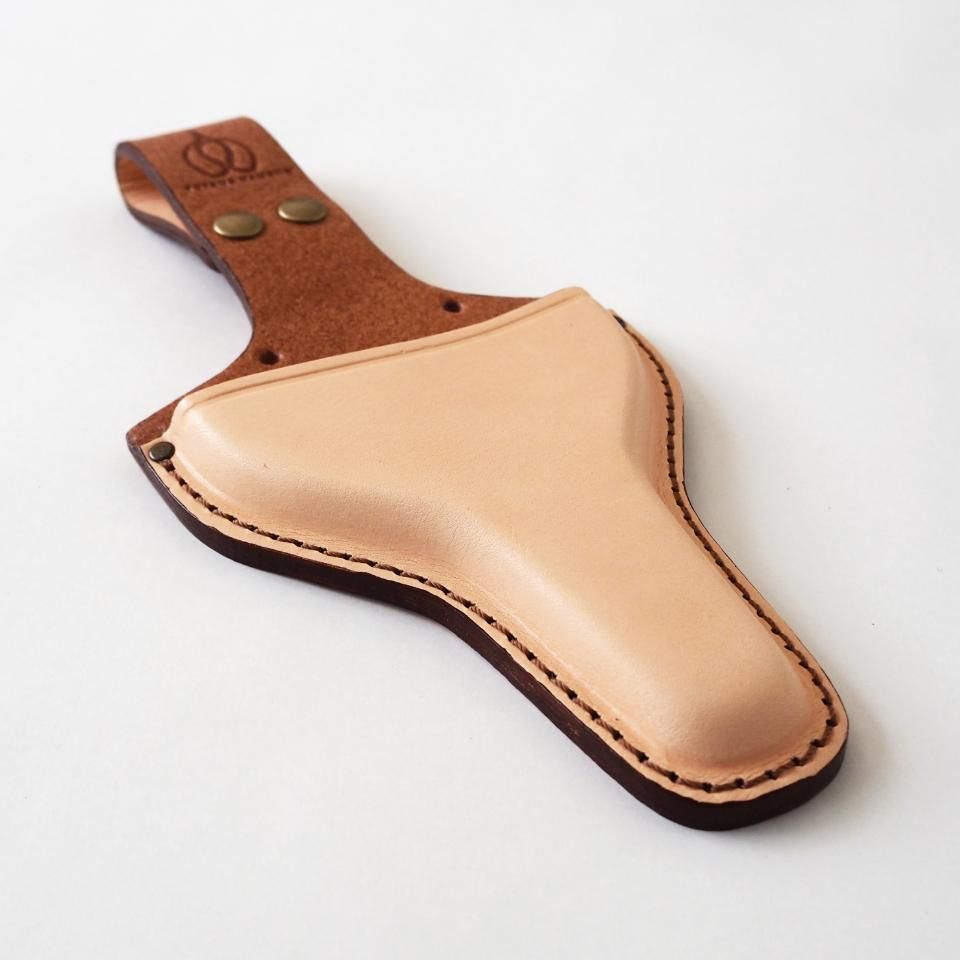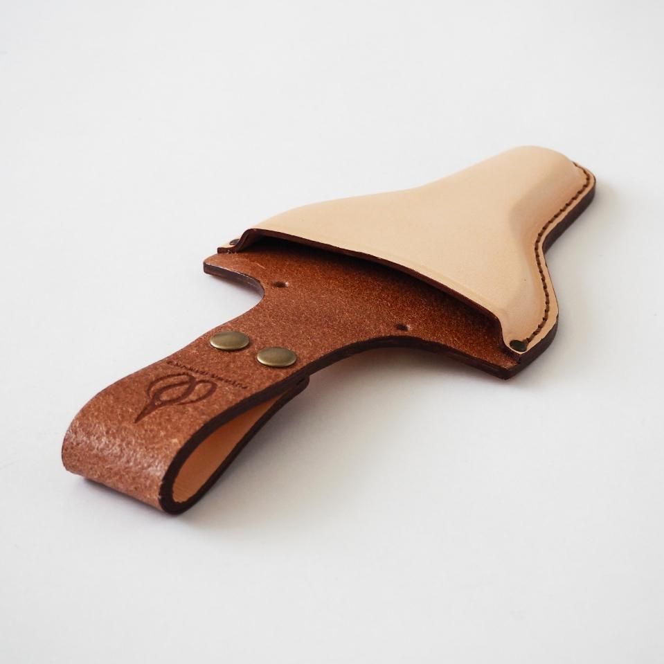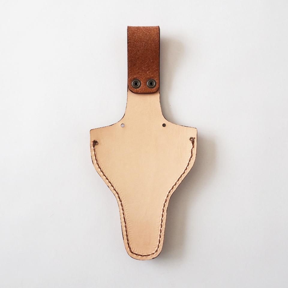 ベルトにサッと取り付けられる革の鋏ケースです。厚手のヌメ革を使っているので、とにかく頑丈。使い込むほどに色味が深まり、自分だけの味わいに育っていきます。また、ベルトを外さなくてもボタンで簡単に装着できるのも嬉しいポイント。さらに、二つの穴に紐を通せば肩掛けポーチとしても使えますし、どこかに固定することも可能。アイデア次第で、いろんな使い方ができる万能ケースです。