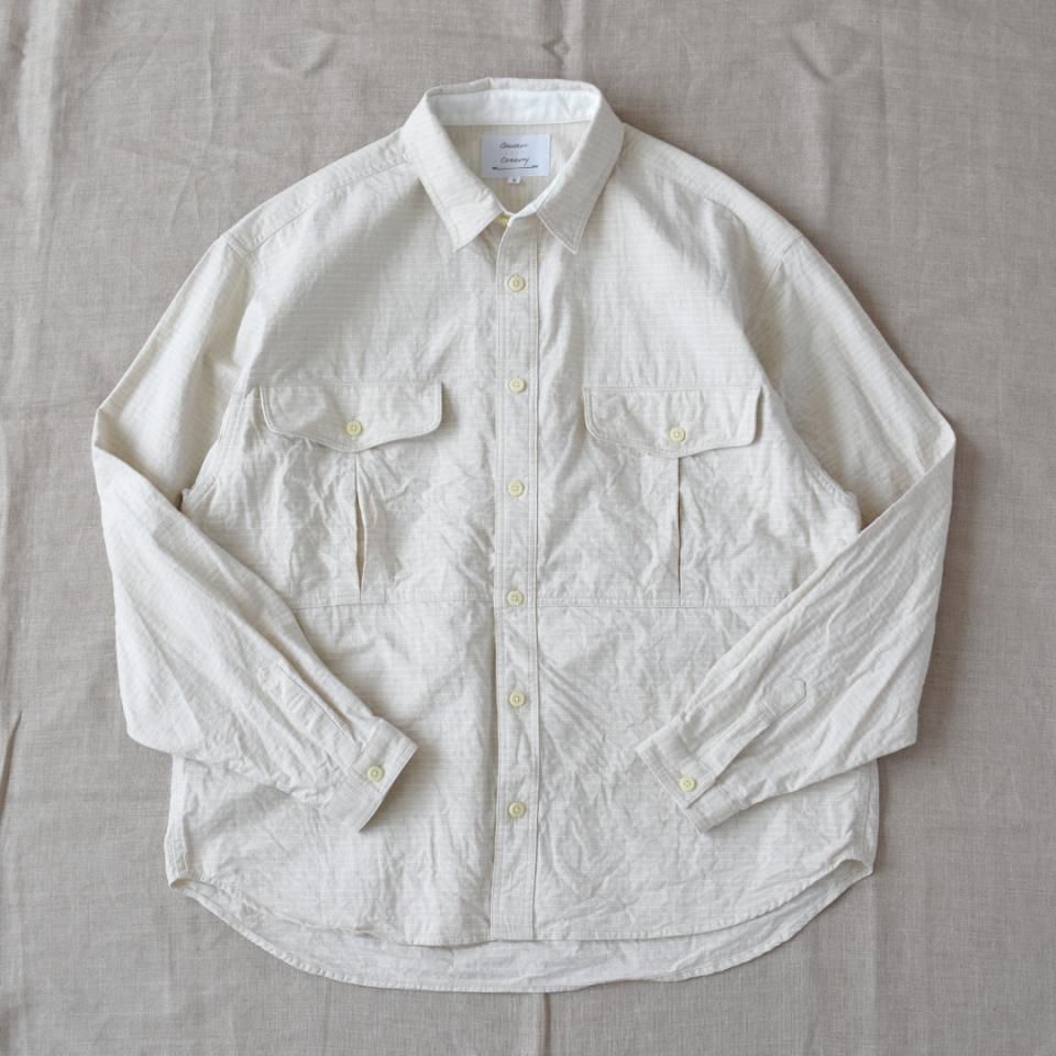 シャツ生地としては肉厚のコットンヘンプ素材。生地に強度を加えるために、格子状の強い糸を織り交ぜて織られたリップストップ生地で、この構造により、破れが生じてもその部分にとどまり広がりにくくなります。コットンヘンプのリップストップは、アウトドア用衣料やバッグ、テントなどの製品によく使われ、強度が高く、耐久性があり通気性も良いヘンプを混ぜることでさらに特徴が際立ちます。ナイロンではなくヘンプを使うことで天然素材ならではの肌触りが生まれ、洗濯後の起毛具合や生地が育つ様子も楽しみな素材です。