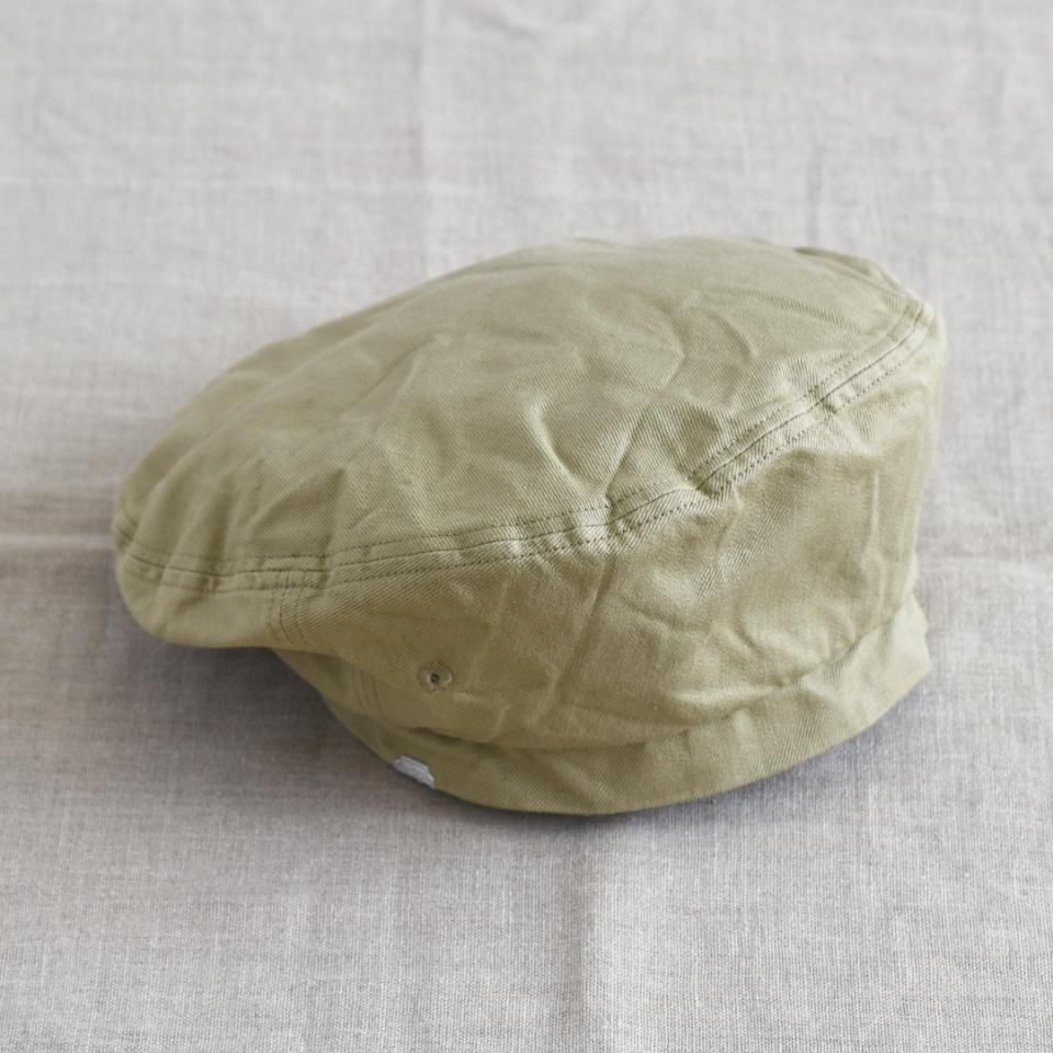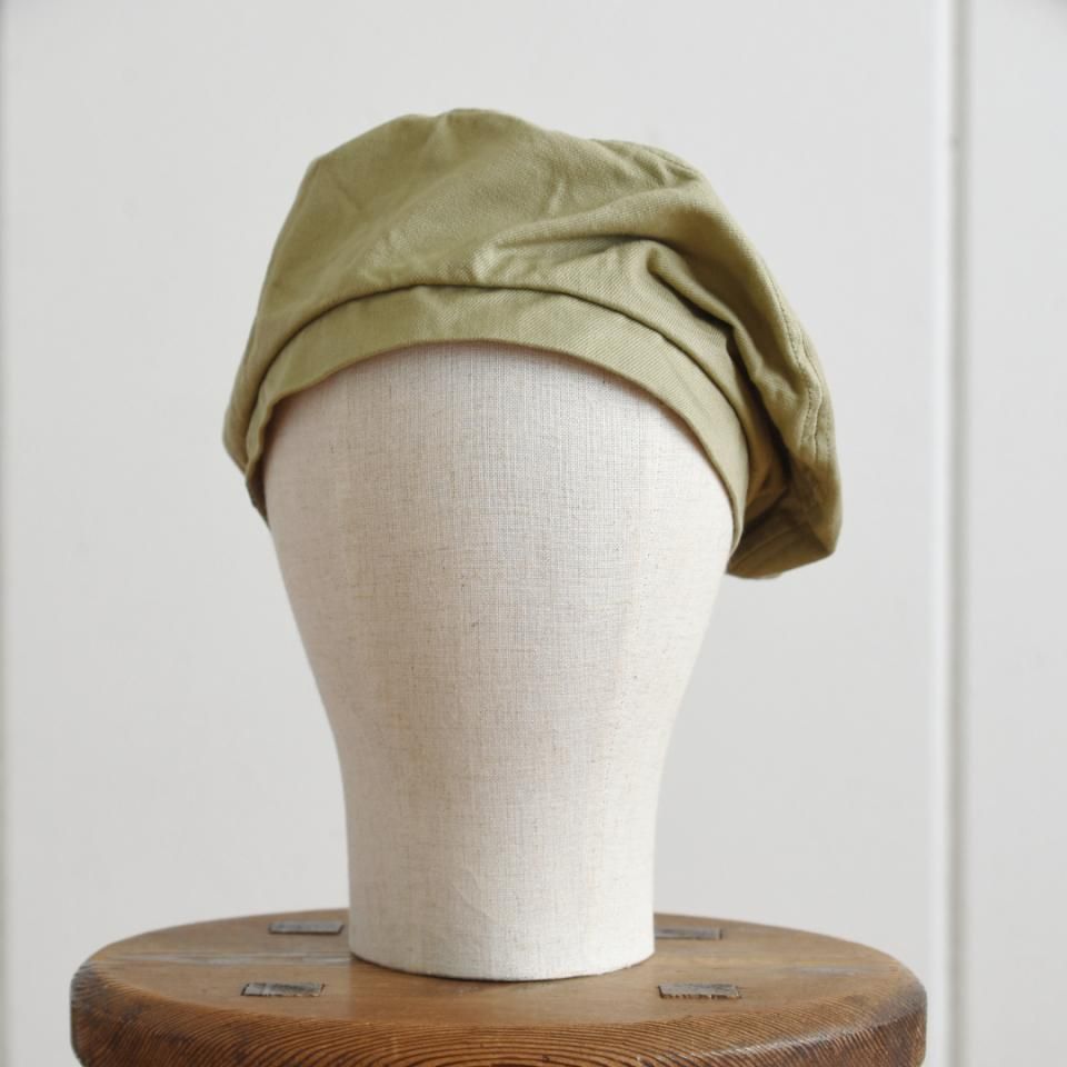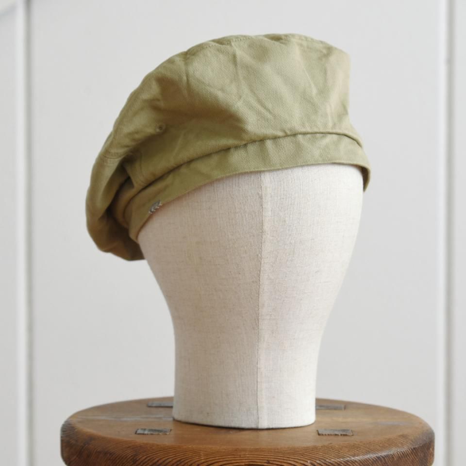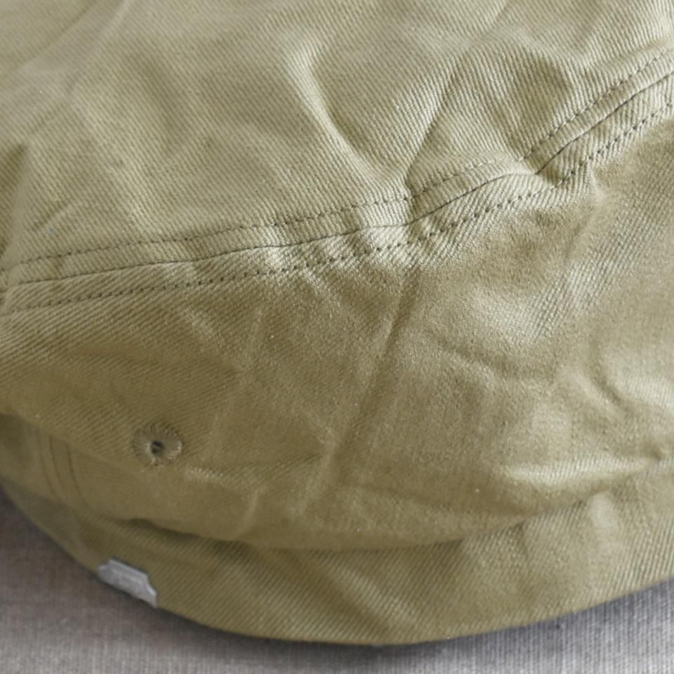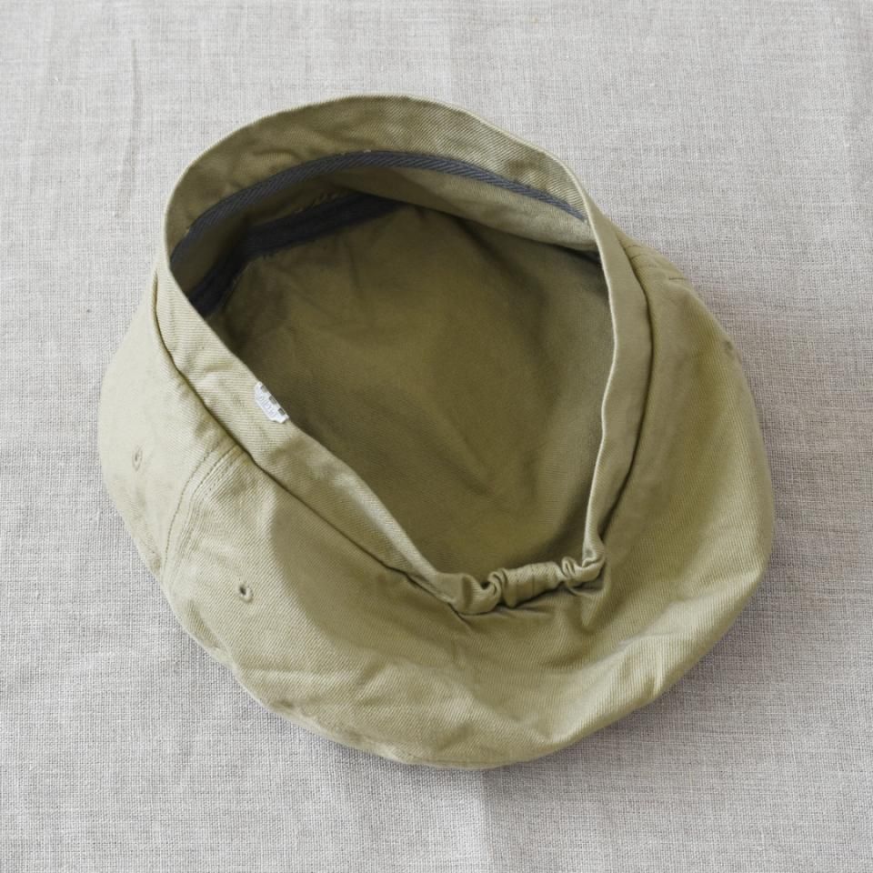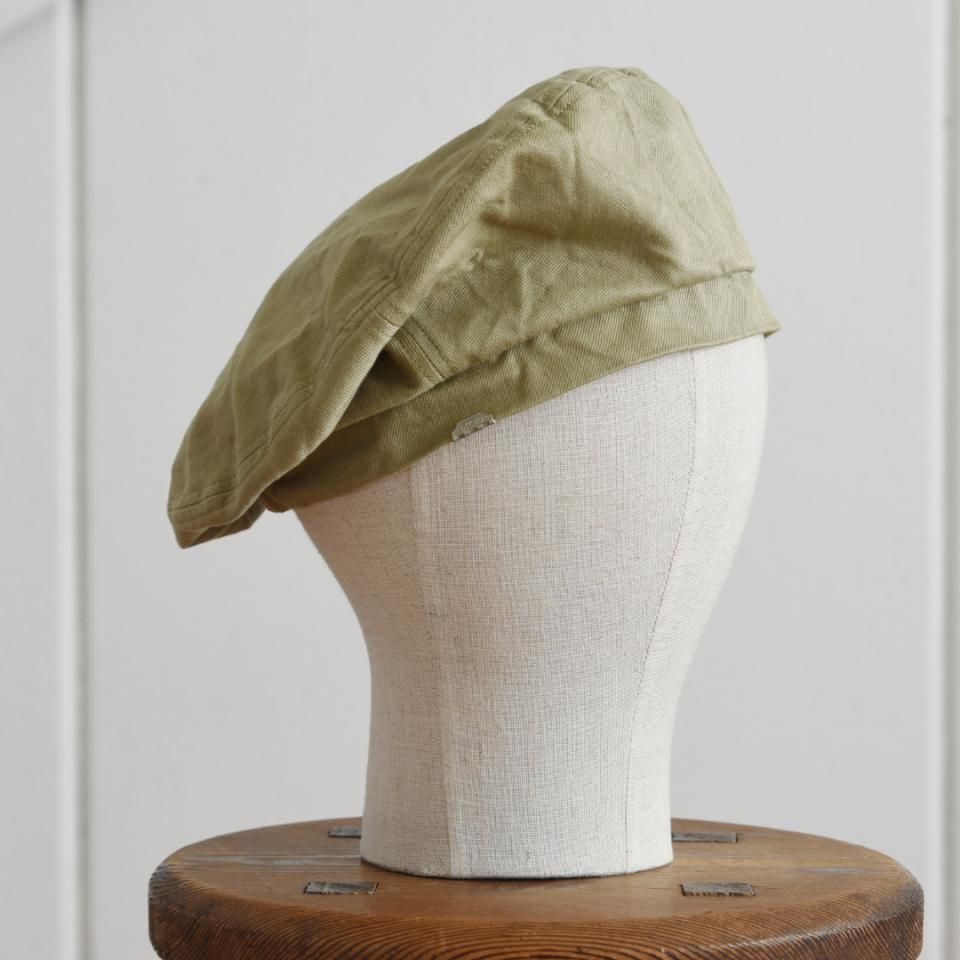 ベーシックな大振りベレー帽。倒し方向を変えたアレンジを楽しめます。生地はフランス軍のM52のリプロダクト素材のコットンツイル。経年変化により柔らかくなり、独特の風合いが出るため、ヴィンテージファンに支持されています。光沢を抑え、あえて毛羽たちを残す事でヴィンテージ感を表現し膨らみのある風合いが特徴です。