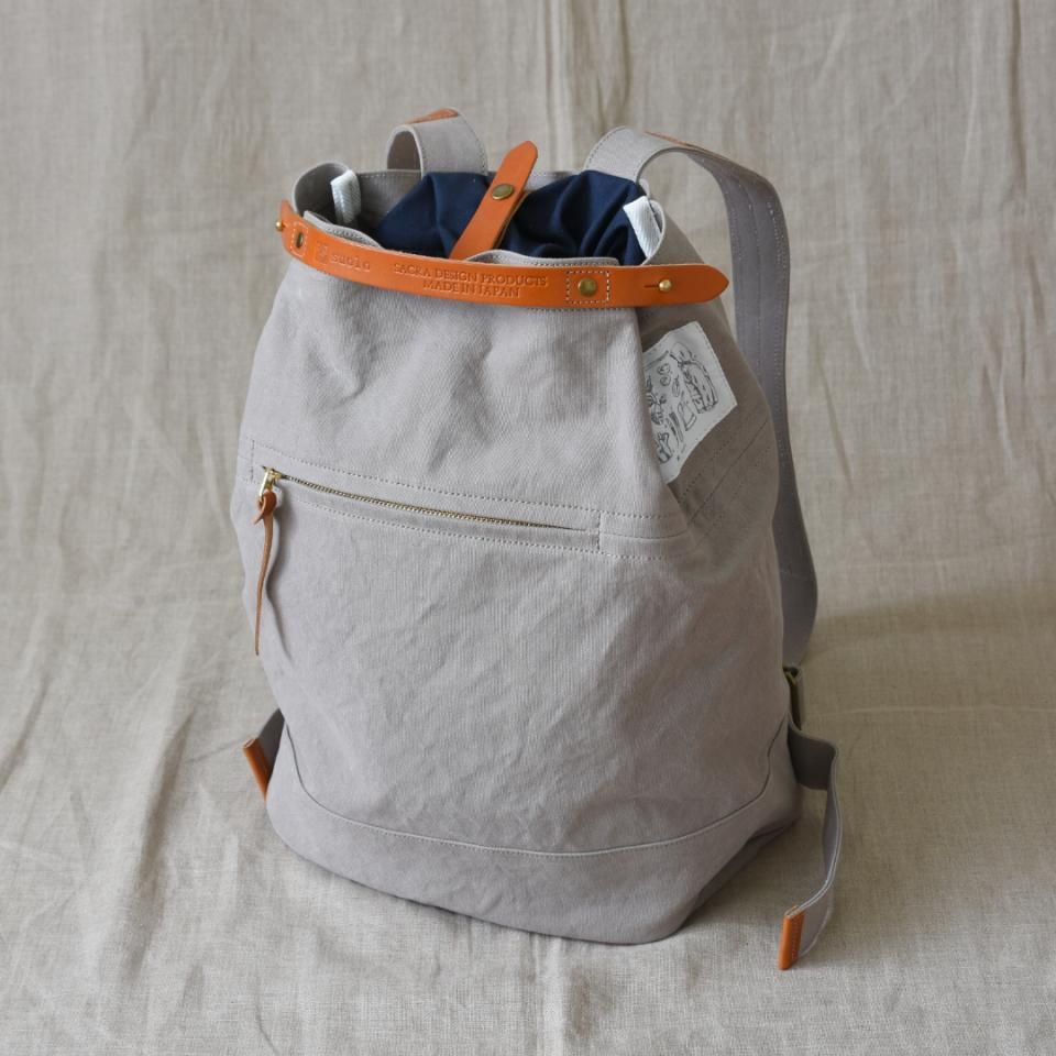 背負い籠(かご)をヒントにした遊び心あるデザインのバッグです。サイドのギボシ金具で鞄口の広さを自由に調整できるので、荷物の量に合わせて使い方をアレンジできます。巾着状の布と内側の革ストラップ付きなので、ギボシを留めなくてもサッと開け閉めが可能。外側にはファスナーポケットも付いていて、スマホや定期など「すぐ取り出したいモノ」もストレスなく収納できます。