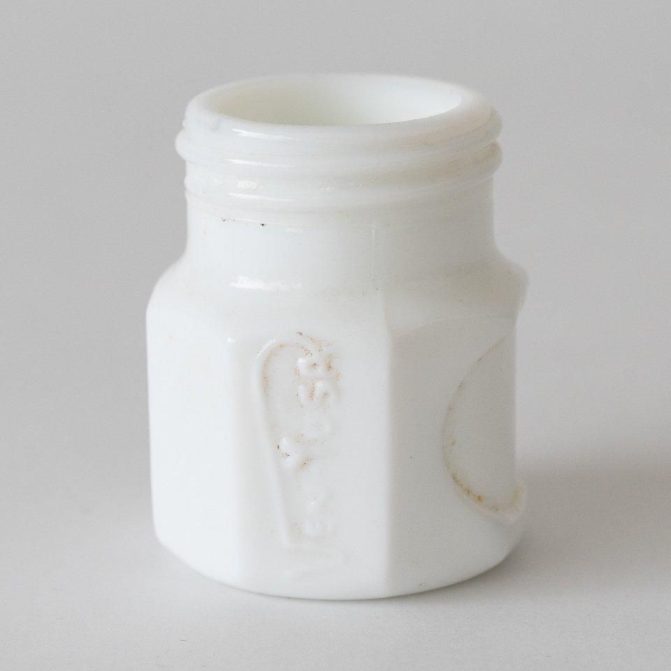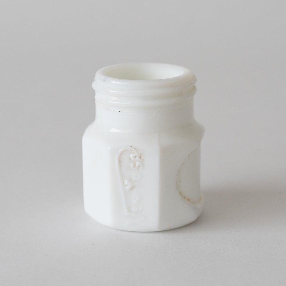 イギリスで使われていた白いガラスのインクボトル。これらのボトルは主に18世紀から19世紀にかけて製造され、特にアンティーク市場で価値のあるアイテム。窓枠のデザインやエンボス加工が施され、19世紀の学校やオフィスで広く使われていました。クラシックで品のあるデザインを持つため、インテリアの一部としても人気があります。