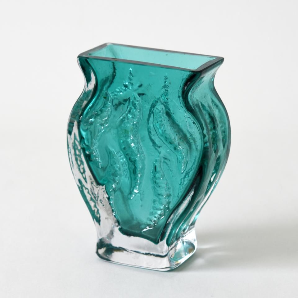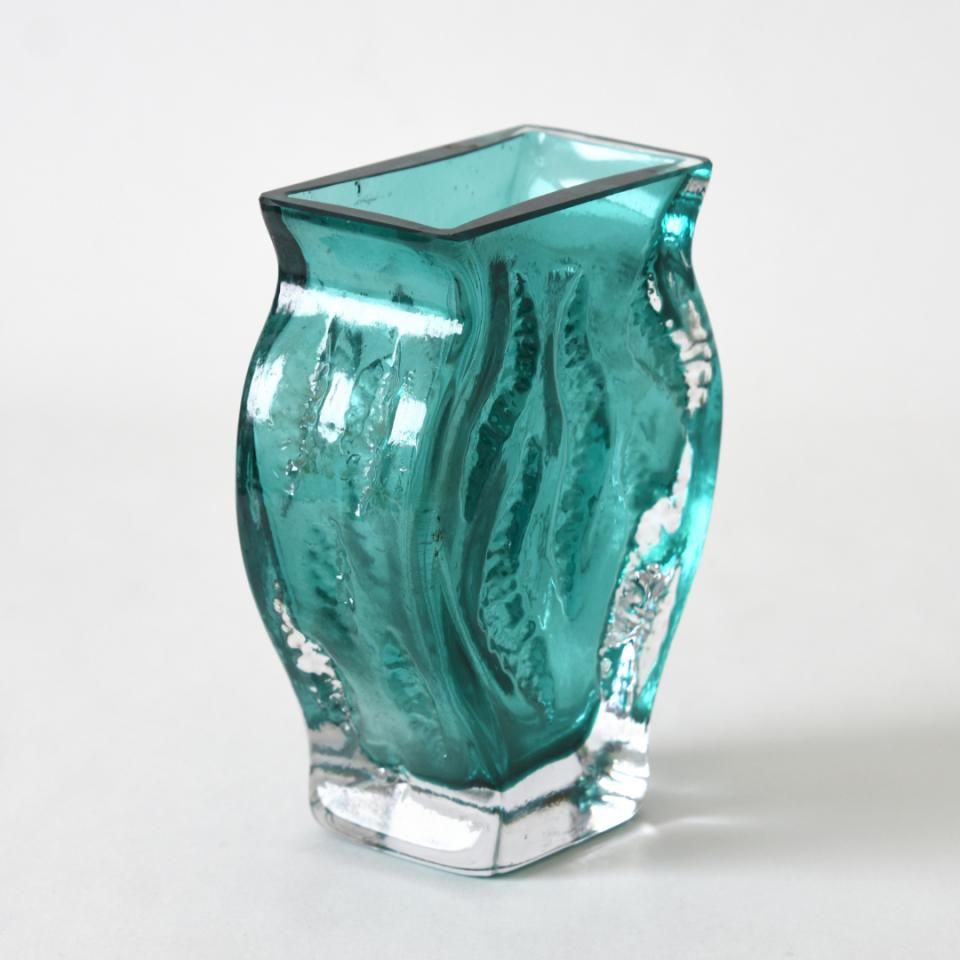 1970年代西ドイツの時代にIngrid Glas(イングリッド・グラス)のKurt Wokan(クルト・ヴォーカン)によりデザインされたガラスベース。細部にわたり丁寧に作られた氷彫刻のようなデザイン。エメラルド色の発色が特長的であり高級感が漂よう美しい花瓶です。台座にはサインと番号が刻まれています。ヨーロッパではミッドセンチュリーのインテリアの一つとしてコレクターに人気のシリーズです。