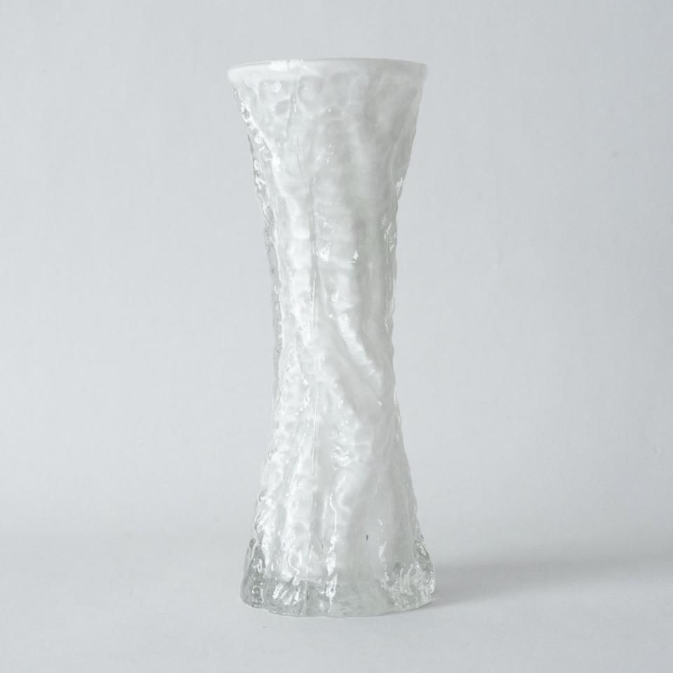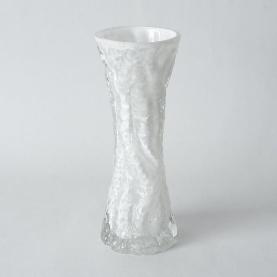 1970年代西ドイツの時代に作られたガラスベース。細部にわたり丁寧に作られた氷彫刻のようなデザイン。表が透明で内側が白色のガラスです。刻印がないため確証はございませんが、Ingrid Glas(イングリッド・グラス)製Kurt Wokan(クルト・ヴォーカン)デザインの作品とみられるデザインです。高級感が漂よう美しい花瓶です。ヨーロッパではミッドセンチュリーのインテリアの一つとしてコレクターに人気のデザインです。