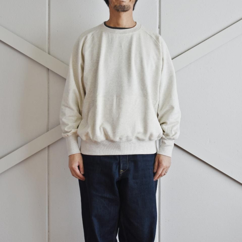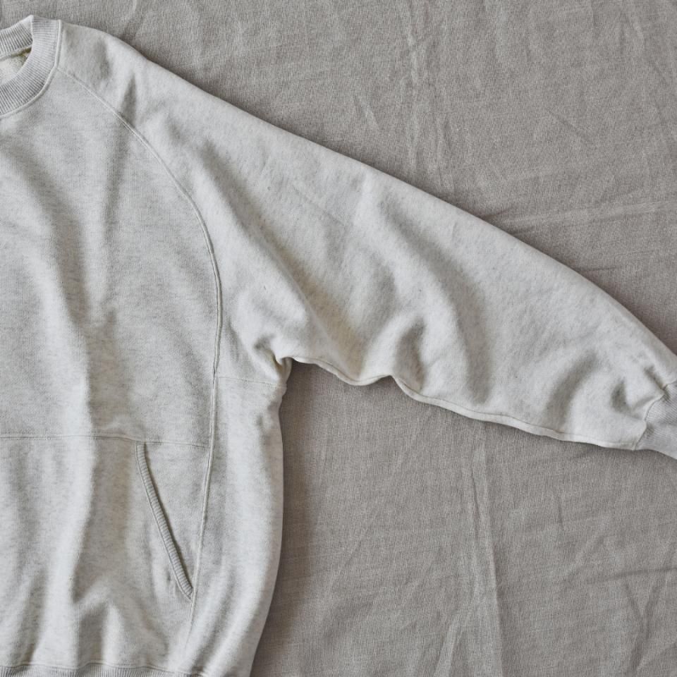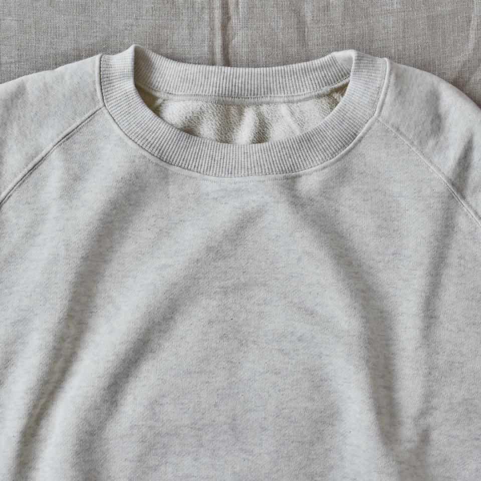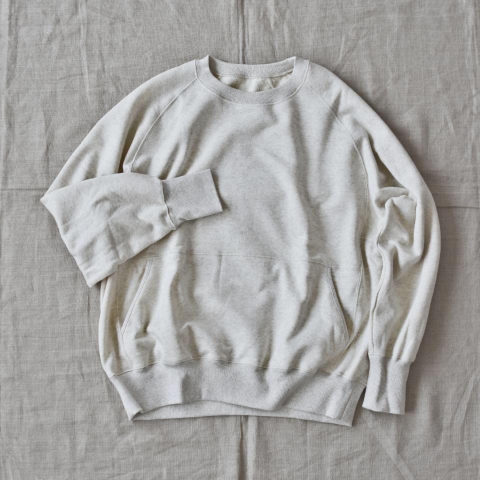 春先に向けて活躍する、嵩張らず使いやすい厚みの裏毛素材を採用したクルーネックのスウェット。クリームベースのオートミールカラーで、薄いグレー調の杢が織り込まれた上品な色合いが特徴です。表面はクリアで洗練された仕上がりになっており、細部にまでこだわったデザインが魅力です。