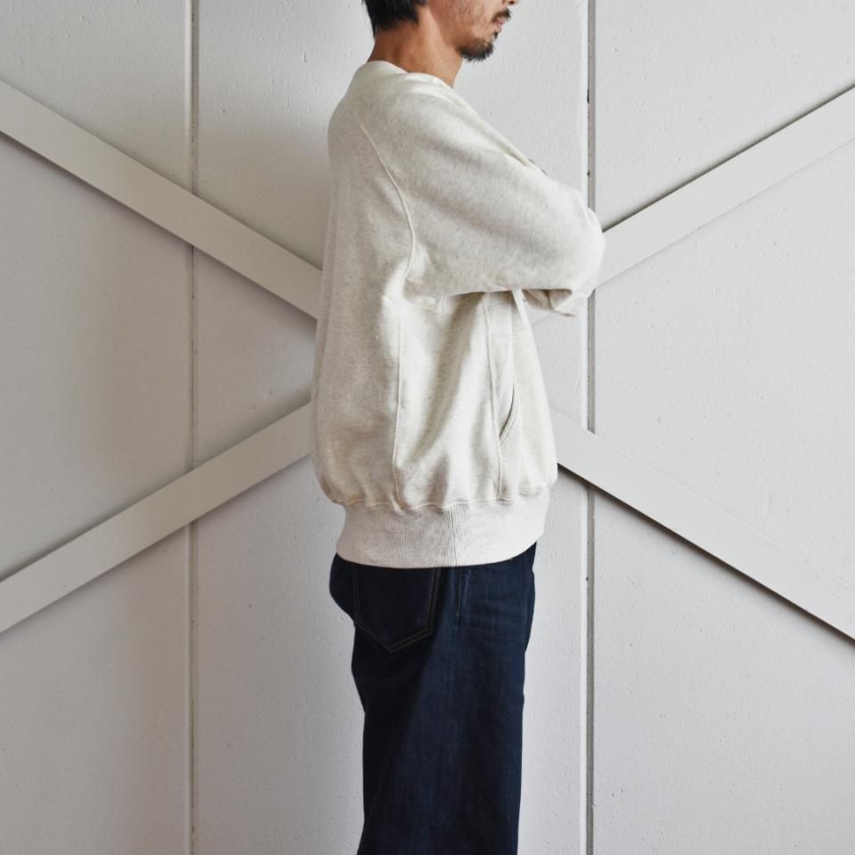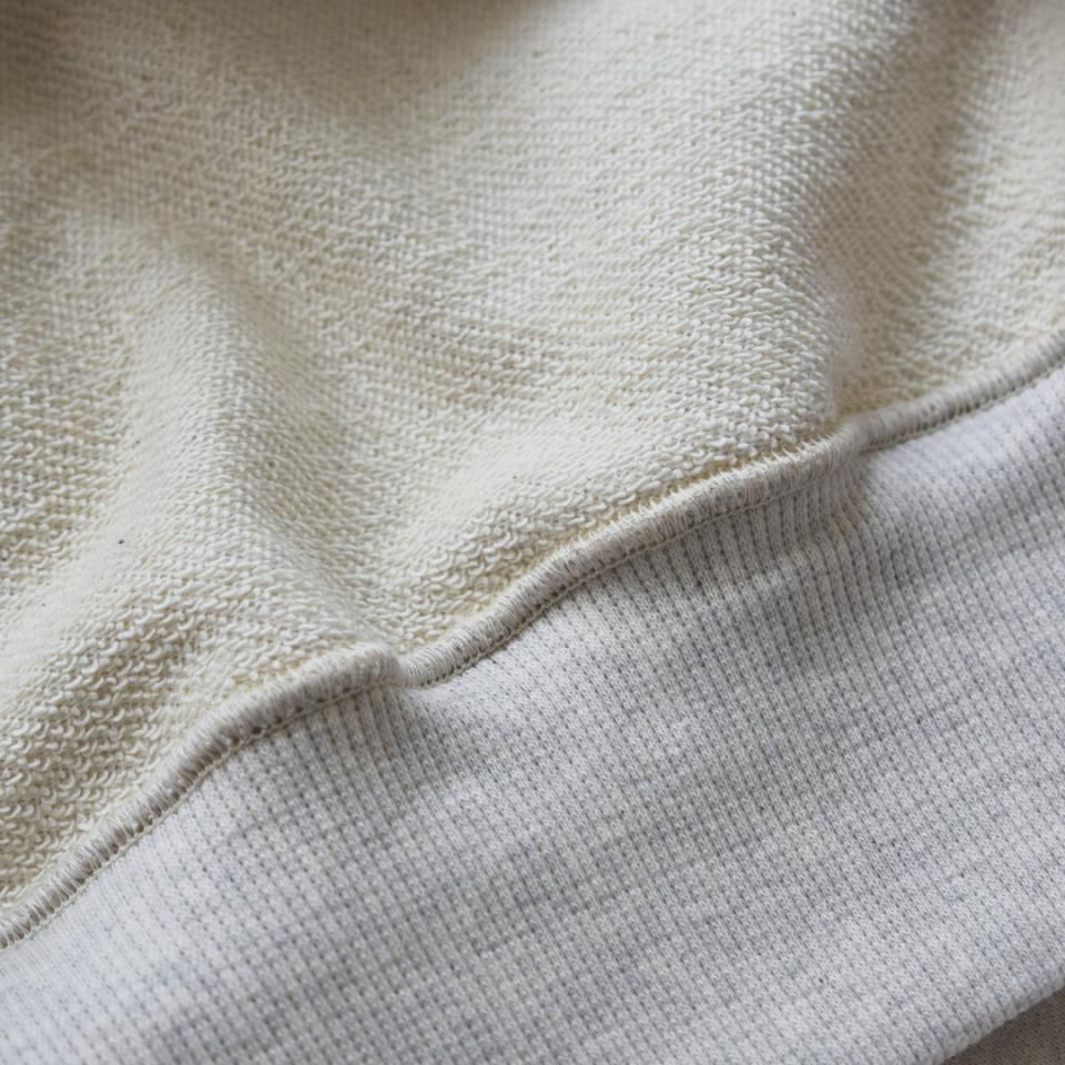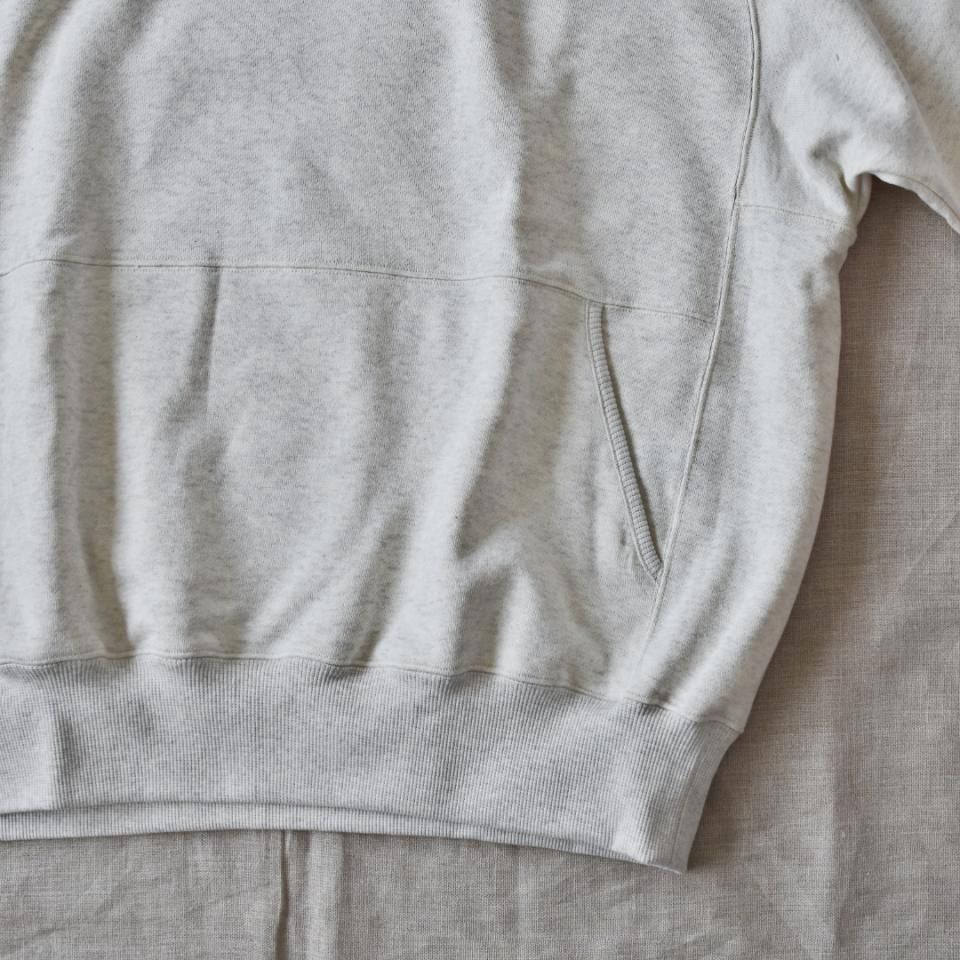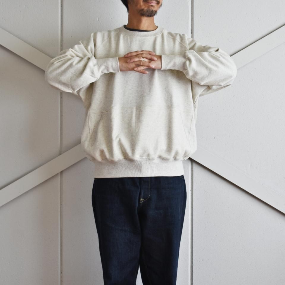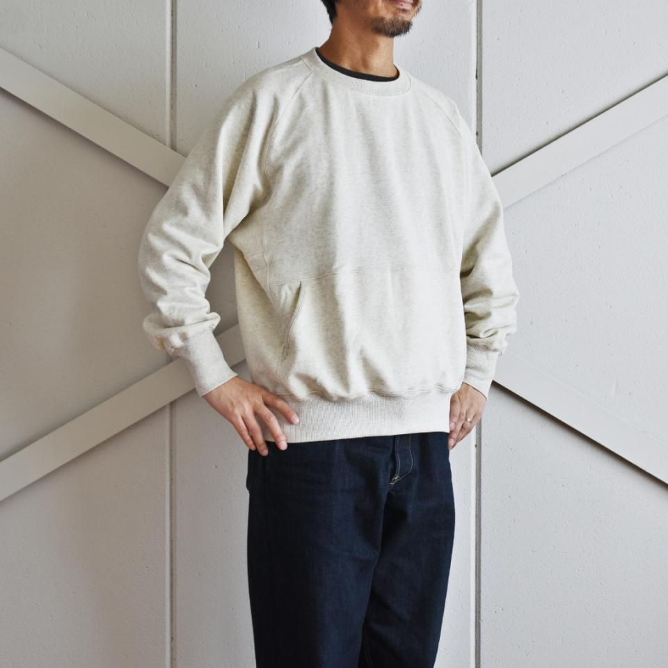 春先に向けて活躍する、嵩張らず使いやすい厚みの裏毛素材を採用したクルーネックのスウェット。クリームベースのオートミールカラーで、薄いグレー調の杢が織り込まれた上品な色合いが特徴です。表面はクリアで洗練された仕上がりになっており、細部にまでこだわったデザインが魅力です。