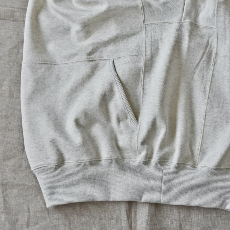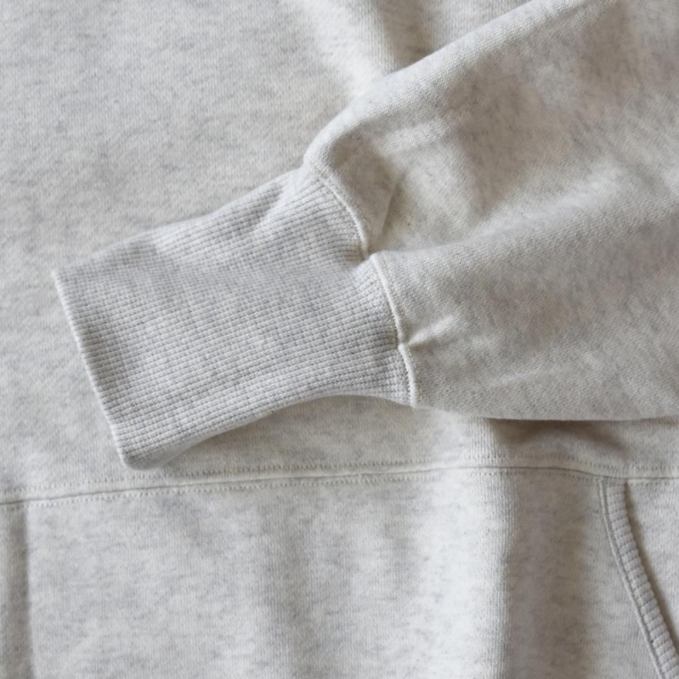 袖口には10cmと長めのリブを採用し、キックバックの強いしっかりとした素材を使用しています。インナーとして着る際にはリブをそのまま長めに使ったり、一枚で着用する場合には二つ折りにしてやや短めに調整できるよう工夫されています。また、裾のリブは経年劣化による伸びを考慮し、やや狭めに設定されています。前身頃には切り替えデザインのカンガルーポケットがあり、ポケット口は補強を施しつつ、フライス素材でシンプルに仕上げています。