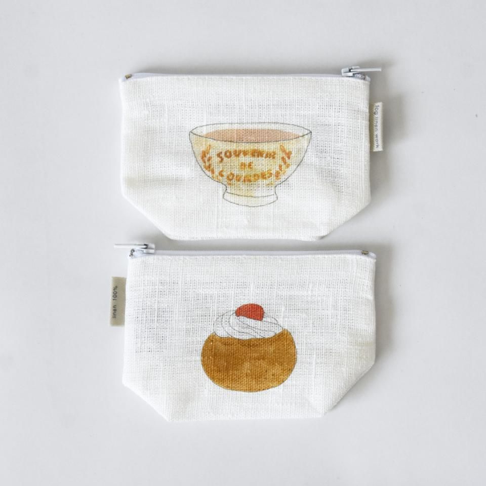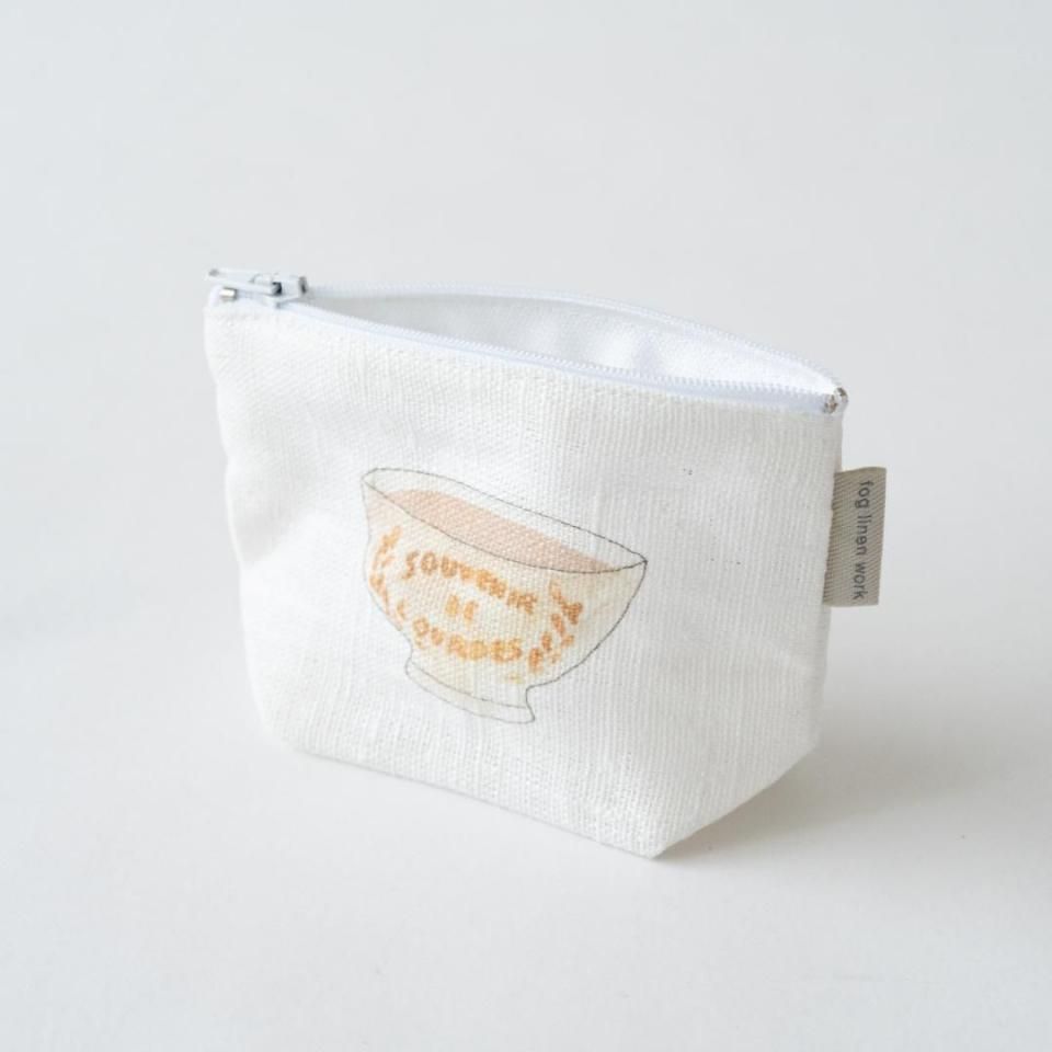 フランスのアーティスト、イザベル・ボワノが描くカフェオレボウルとケーキのイラストを、Fog Linen Work(フォグリネンワーク)のリネン生地にプリントしたミニポーチ。