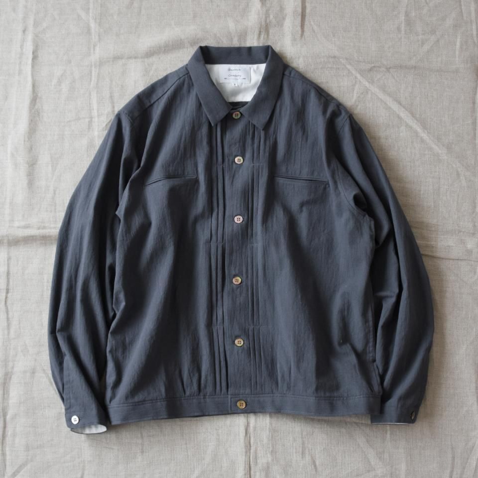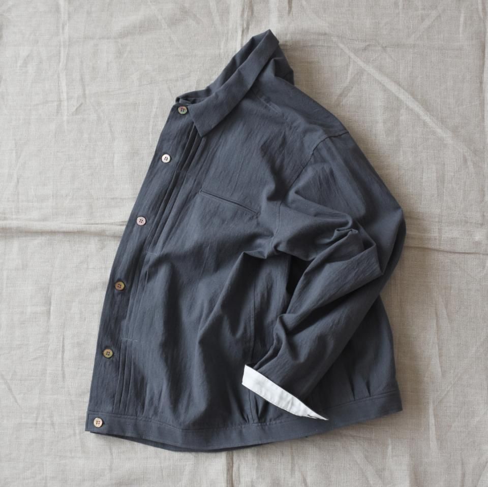 綿麻特有のドライタッチで軽やかな生地。薄過ぎず厚過ぎずの中肉厚。ワークウエアでよく採用されるダブルステッチではなく、縫い代をきれいに処理して表に縫い目が見えないように仕立てられていて、綿麻の軽やかさとデザイン性や色味から来る上品な質感も感じられる生地です。洗いざらしで着ても良し、アイロンをかけて綺麗に着ても良しの一着です。