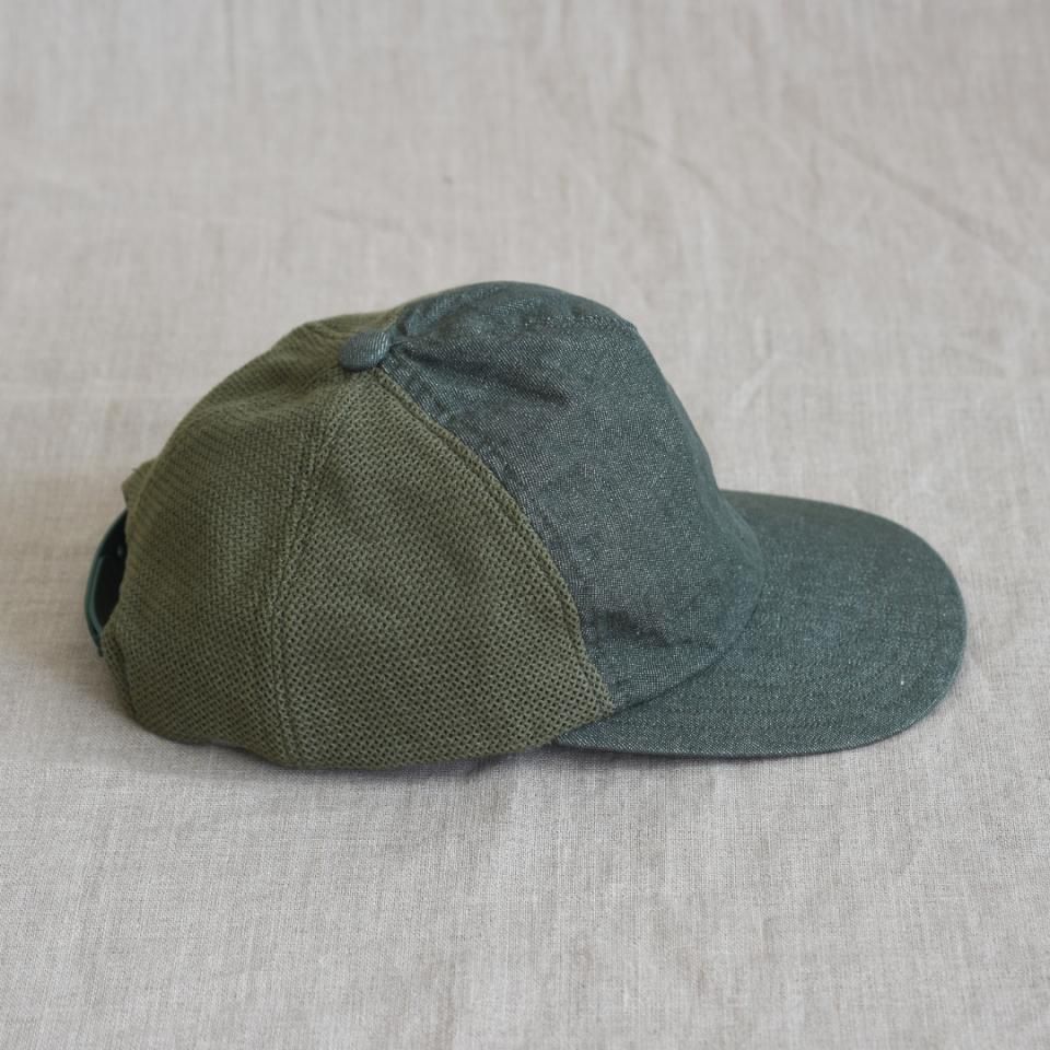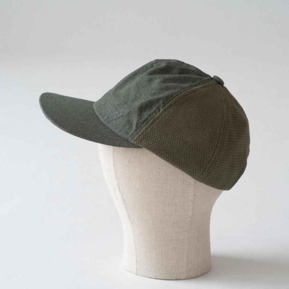 コットンキャンバス地とメッシュ地の切り替えのキャップ。メッシュ生地としては珍しい綿素材を使用。風通しの良さだけでなく、吸水性も兼ね備えており、メッシュ部分も含めて天然素材ならではの経年変化を楽しんでいただけます。