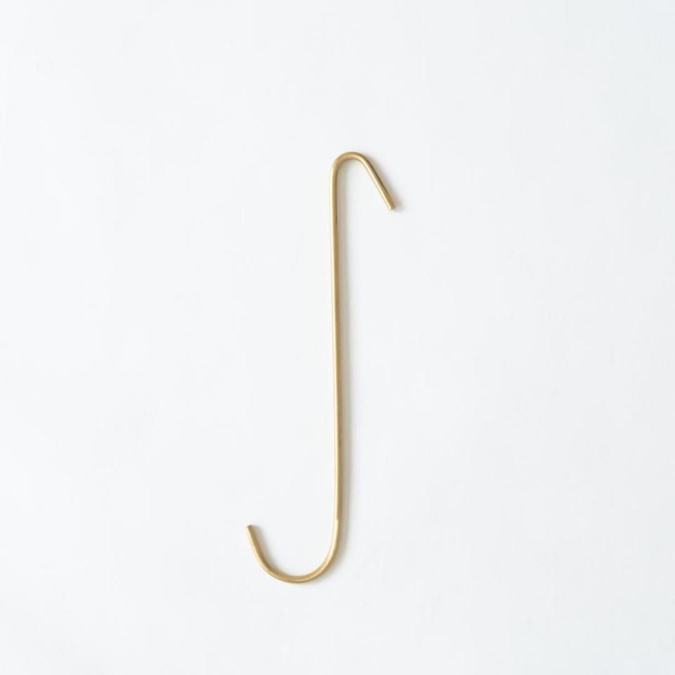 暮らしの様々なシーンで役立つS字フック。ロングタイプ。上下でカーブの形が異なるので、使う場所や引っかけるものによって、フックの向きを変えて使うことができます。艶のない、少しくすんだブラスの自然な色と質感です。