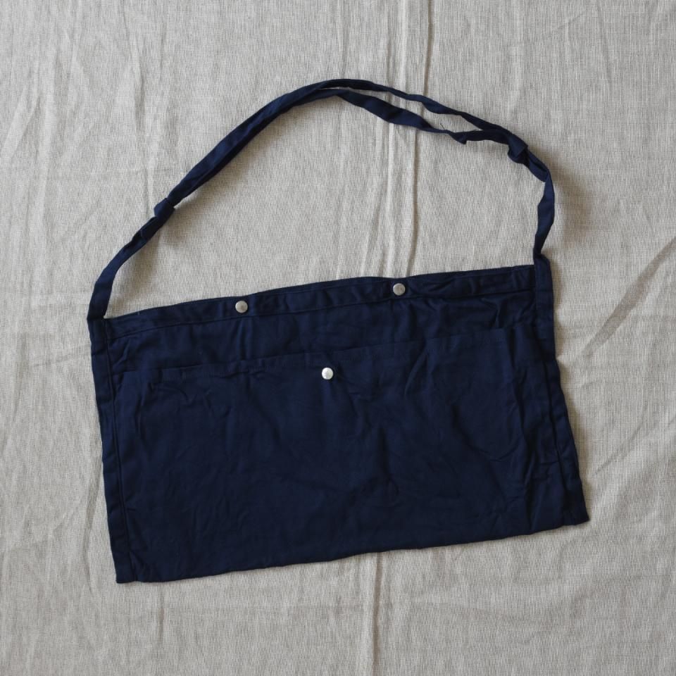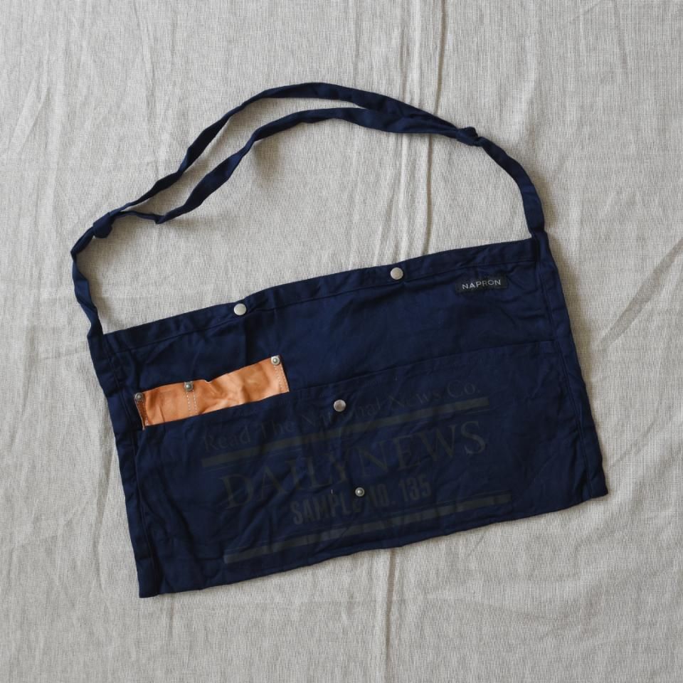 ウエストエプロンとしてだけでなく、斜め掛けのショルダーバッグとしても使用できるバッグとエプロンの中間のようなアイテム。前面にはスナップボタン付きの大きなポケットと小物を収納する革ポケットがあり、背面にもスナップボタン付きのフルサイズポケットが付いているため、収納力が抜群です。プリント後、ロウ引き加工を施し、使い古されたような風合いに仕上げています。