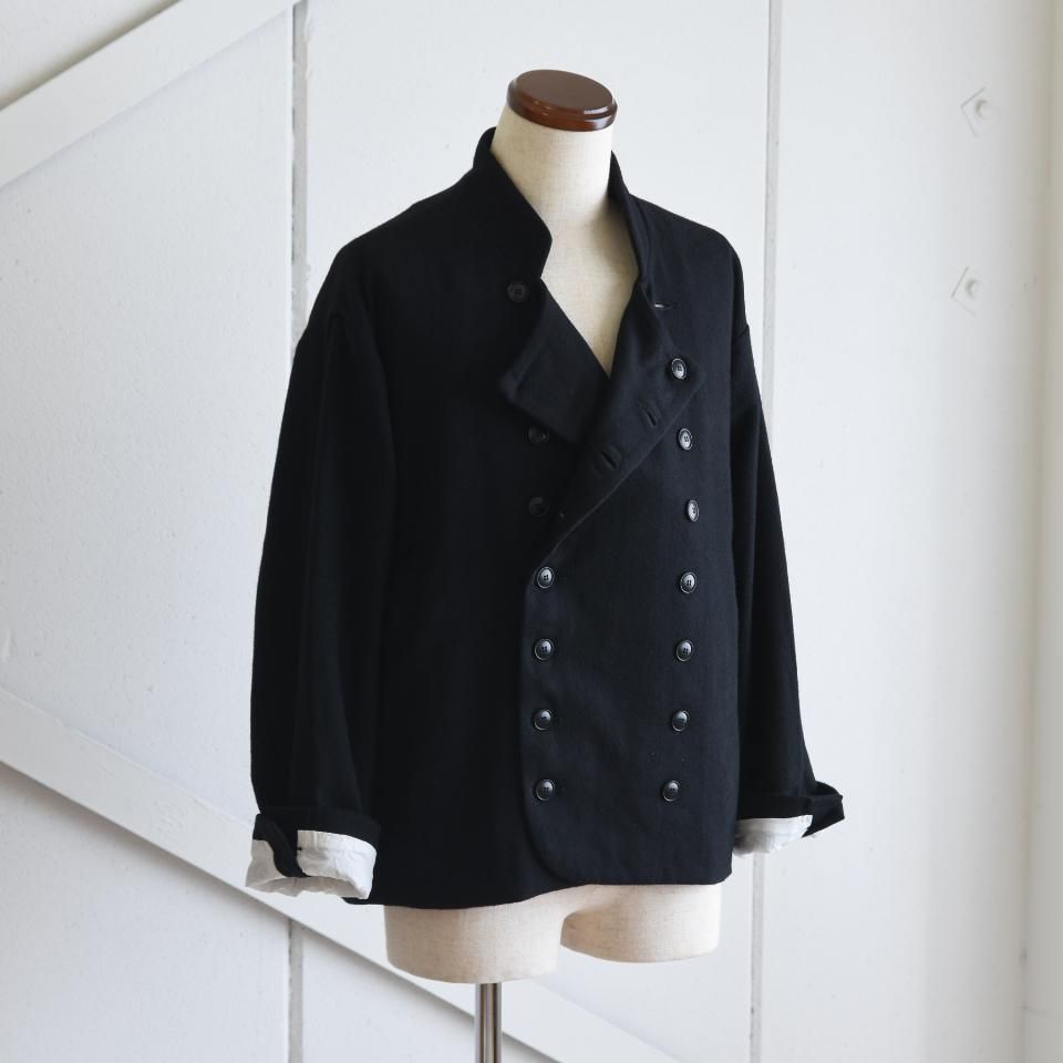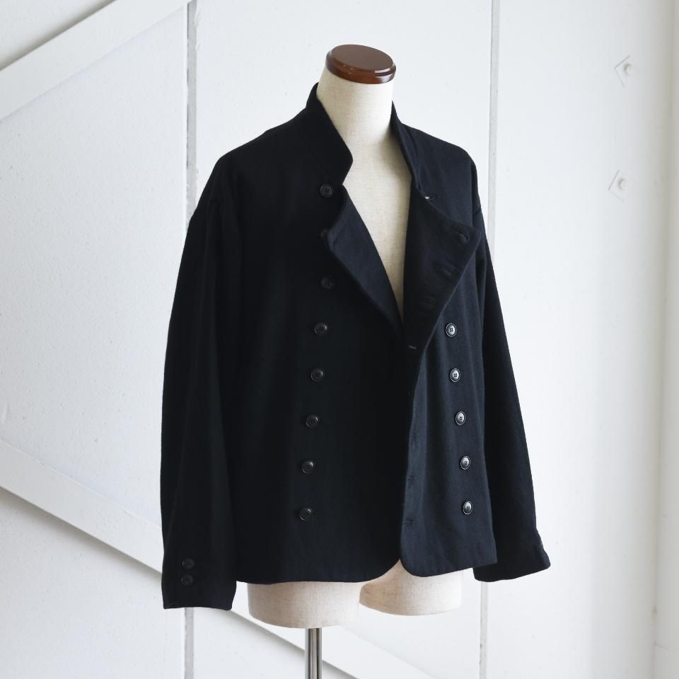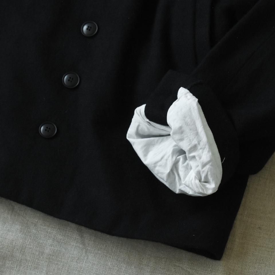 bio kochシリーズのクラシックなウールジャケット。一見かっちりとした印象になりやすいダブルジャケットですが、こちらはボックスシルエットと首まわりのデザインによって、ほどよくラフな雰囲気に仕上がっています。また、ボタンの留め方をアレンジすることで、さまざまな着こなしを楽しめるのも魅力です。生地の質感を引き出すために軽く洗いをかけてから仕上げてあります。クラシックでありながら、日常に取り入れやすい一着となっています。