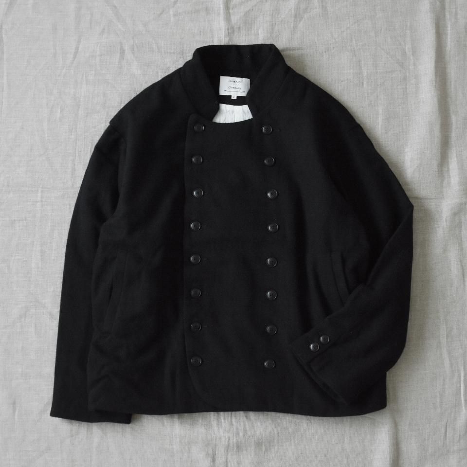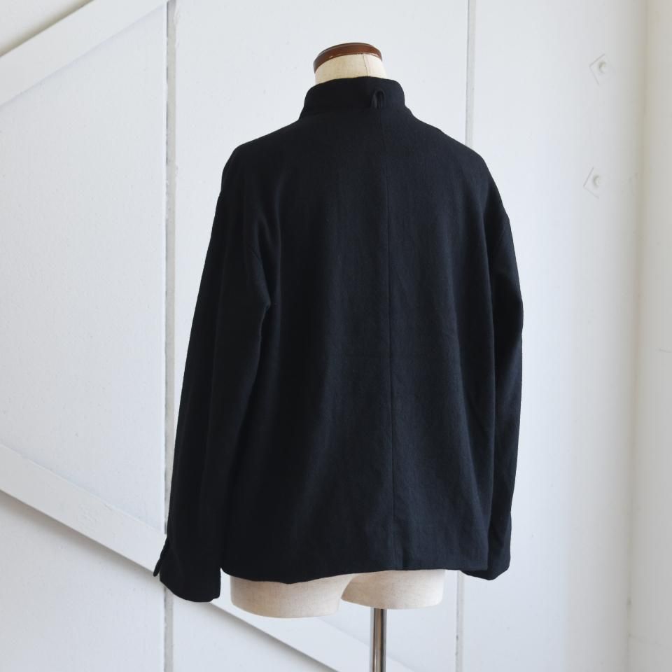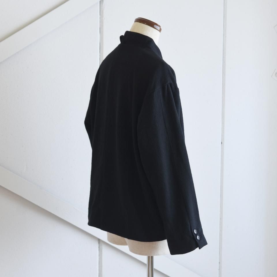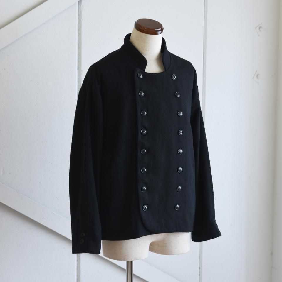 bio kochシリーズのクラシックなウールジャケット。一見かっちりとした印象になりやすいダブルジャケットですが、こちらはボックスシルエットと首まわりのデザインによって、ほどよくラフな雰囲気に仕上がっています。また、ボタンの留め方をアレンジすることで、さまざまな着こなしを楽しめるのも魅力です。生地の質感を引き出すために軽く洗いをかけてから仕上げてあります。クラシックでありながら、日常に取り入れやすい一着となっています。