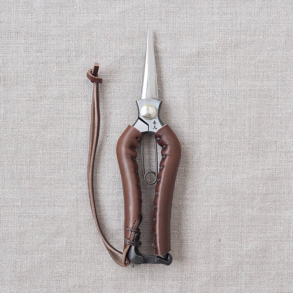 手に優しく見た目に美しい革巻きはさみ。落下防止ループ付き。やわらかい草花や8ミリ以下の小枝の整理に。