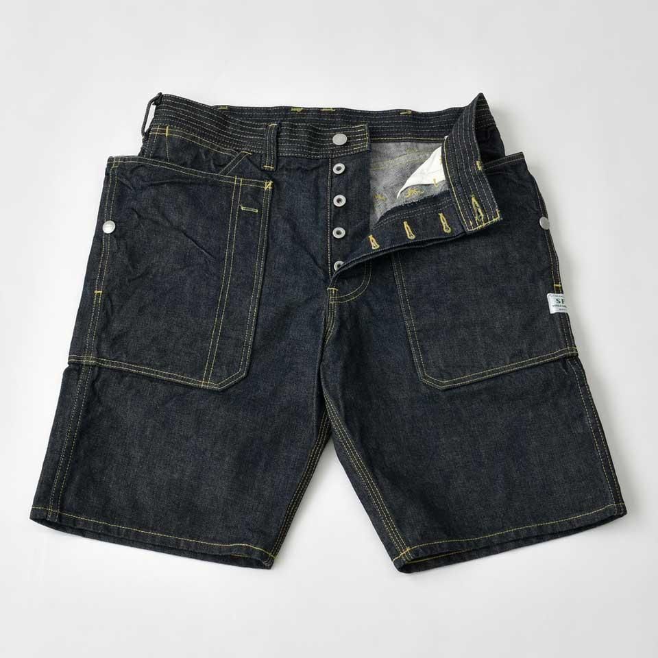ササフラスの代表作の一つフォールリーフ・パンツのショート丈。左綾デニムのイエローステッチで肉厚の13.5オンスは履き込むと味わいのある経年変化を楽しめます。最大の特徴はなんといっても大きめのツールポケット。ガーデニングはもちろん、あらゆるハードワーカーにオススメです。