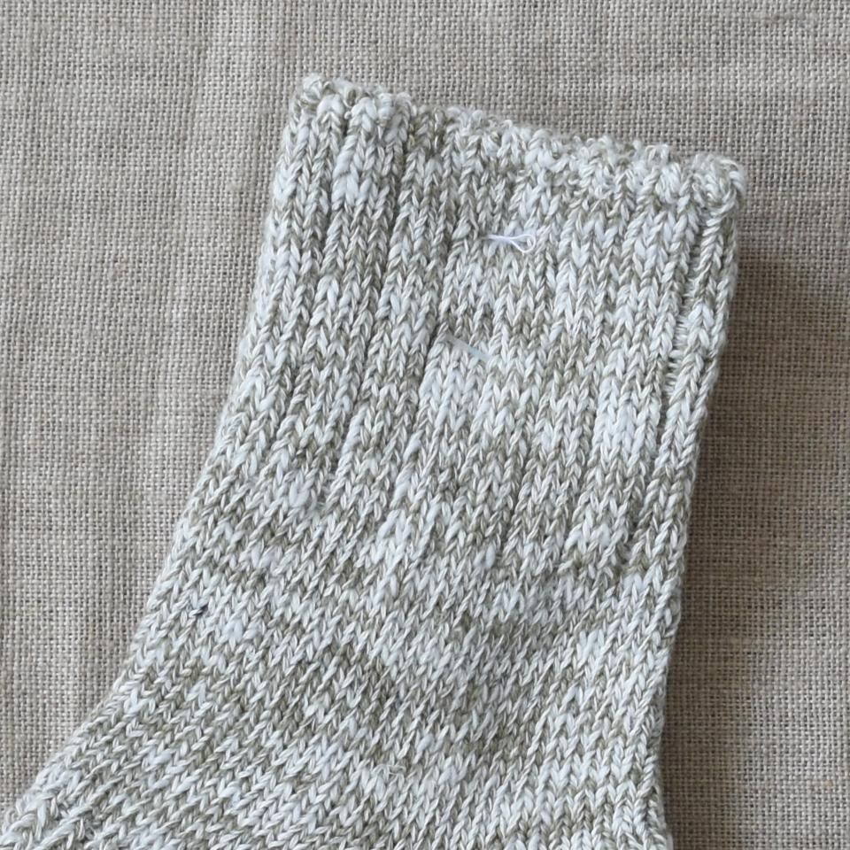 ヘンプ麻混合の太めの糸で編み込まれた肉厚のソックス。丈夫で蒸れにくく、締めつけすぎずズレにくいので長時間履いていても疲れにくい靴下。土踏まずはリブ編みでフィット感があり、ブーツやスニーカー、サンダルなど靴を選ばず合わせやすいデザインです。長く履いても穴が開きにくい耐久性があり、アウトドアや作業用靴下として最適。オールシーズン対応の履き心地も良い靴下です。