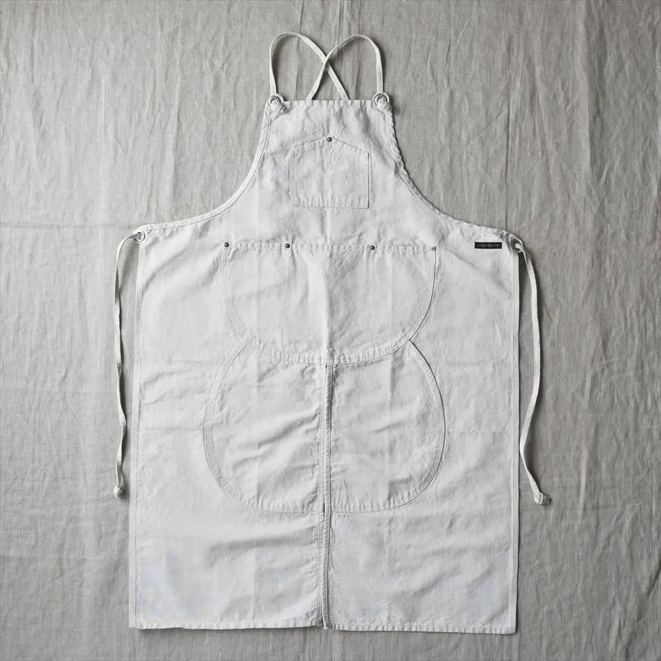 ブランド初期から制作し続けているロングラン製品。USビンテージエプロンからデザインを引用した一着。胸元や腹部、膝部にある当て布にまでもポケットが付いた機能的なエプロン。股部分が割れているのでしゃがみ作業や、階段の上り下りにも役立ちます。後ろはクロスタイプに着ることができる調整紐が付いているので首への負担も少なく長時間の着用も気になりません。麻を混合したシャンブレーなので、若干のシャリ感とシワ感があり、洗いざらしが似合う生地です。