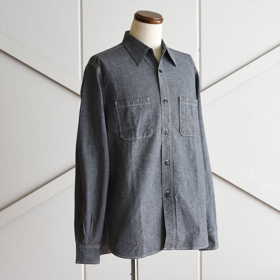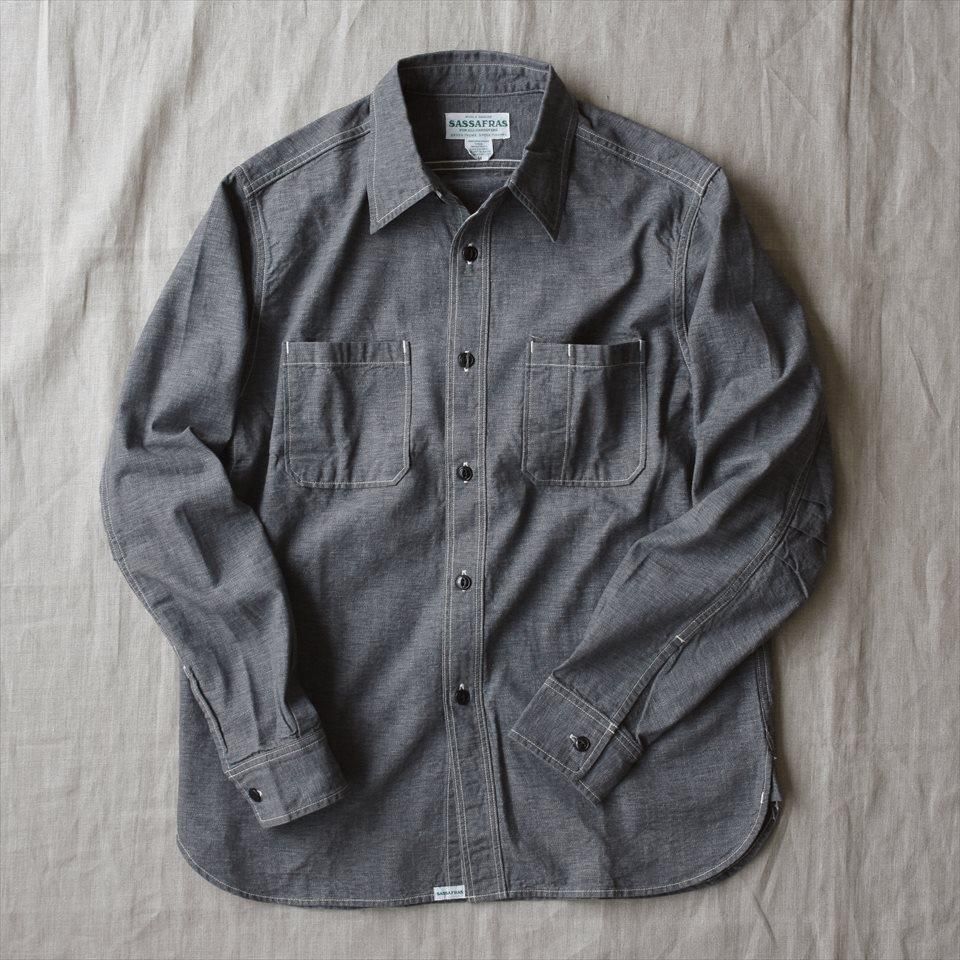 フロント左右に胸ポケットを配したシャツ。白ステッチの軽やかな印象を黒ボタンで引き締めた配色。脇ガセット、肘にタックを入れ、可動域が広い仕様に仕上がっています。シンプルでクラッシックな佇まいですが、ネコ目ボタンやチェーンステッチを施すなど質実剛健なワークウエア仕立て。生地は薄過ぎず厚過ぎずの無骨な5オンス・シャンブレー生地で、オールシーズン対応。ササフラスならではのワークシャツの魅力が随所にみられます。