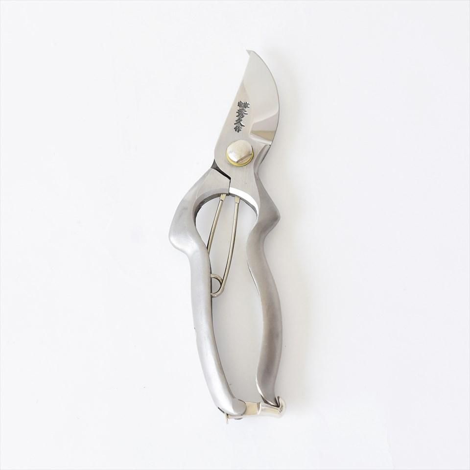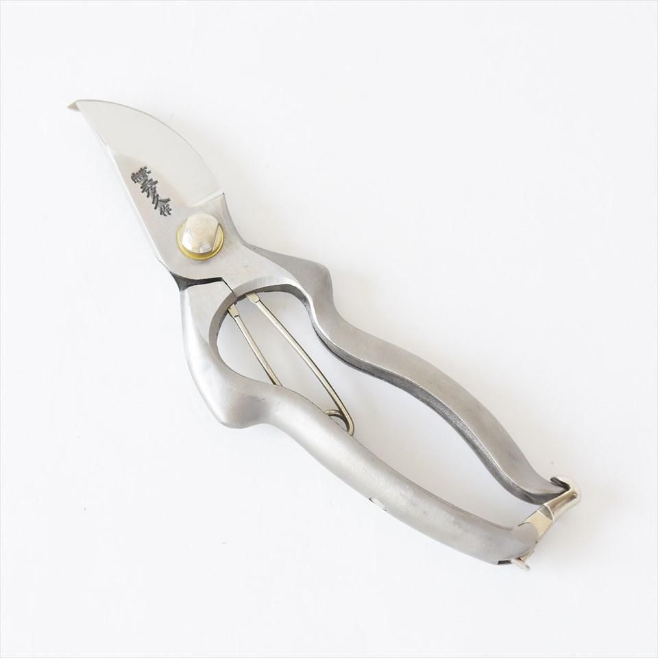 外山刃物さんと出会い、すべての刃物で切らせてもらいました。パチン!と切れる日本の木鋏は、西洋のサクッと切れる感触とは異なる爽快な感触。また、自身でシブ(樹液)をとり、研ぐことで西欧の鋏よりずっと長く愛用できるという点も特筆すべき点。この本職用剪定鋏YP-200は日本の男性の手にしっくりとくる大きさで、肩が張っているので強く握ってもズレにくい鋏です。高硬度のステンレス刃物鋼であるSUS440Cを採用して全身鍛造され、サビに強く、オールラウンドの現場で快適な剪定作業ができます。外山刃物純正の合皮キャップ付き(画像と革色やステッチ、シワ感が異なる場合があります)。